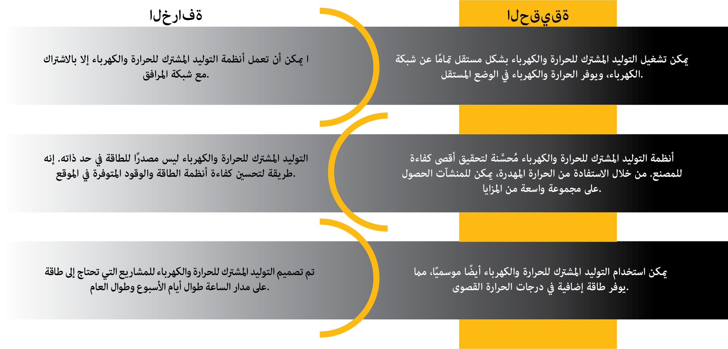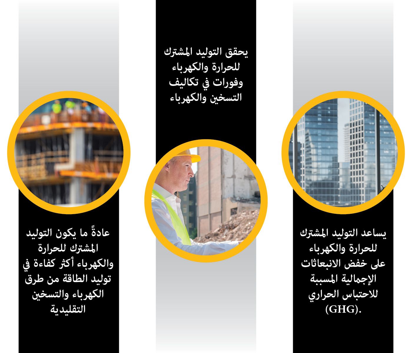 تقوم حلول التوليد المشترك للحرارة والكهرباء بالاحتفاظ بالحرارة من مجموعات المولدات والتي كانت ستُهدر، وتستخدم تلك الطاقة في العمليات الصناعية مثل توفير الحرارة للمباني. وهذا يسمح لأنظمة التوليد المشترك للحرارة والكهرباء بالوصول إلى كفاءة تصل إلى 80% وتقليل كل من تكاليف منشآتك والانبعاثات الصادرة منها. قد تكون هناك ائتمانات ضريبية محلية أو حوافز أخرى يمكن أن تجعل مشروع التوليد المشترك للحرارة والكهرباء الخاص بك أكثر يسرًا من حيث التكلفة.