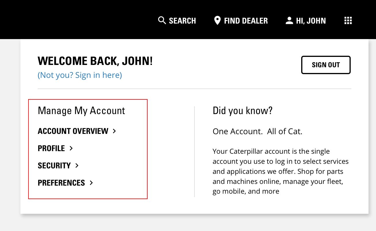 بعد تسجيل الدخول بنجاح إلى Cat.com، يمكنك أيضًا الانتقال إلى صفحة "حسابي" من خلال النقر فوق اسمك، والذي يظهر في الزاوية العلوية اليمنى. ومن هذا المكان، سوف ترى قائمة بالروابط التي تظهر لك. حدد رابط "ملف التعريف" الذي يظهر ضمن قسم "إدارة حسابي".