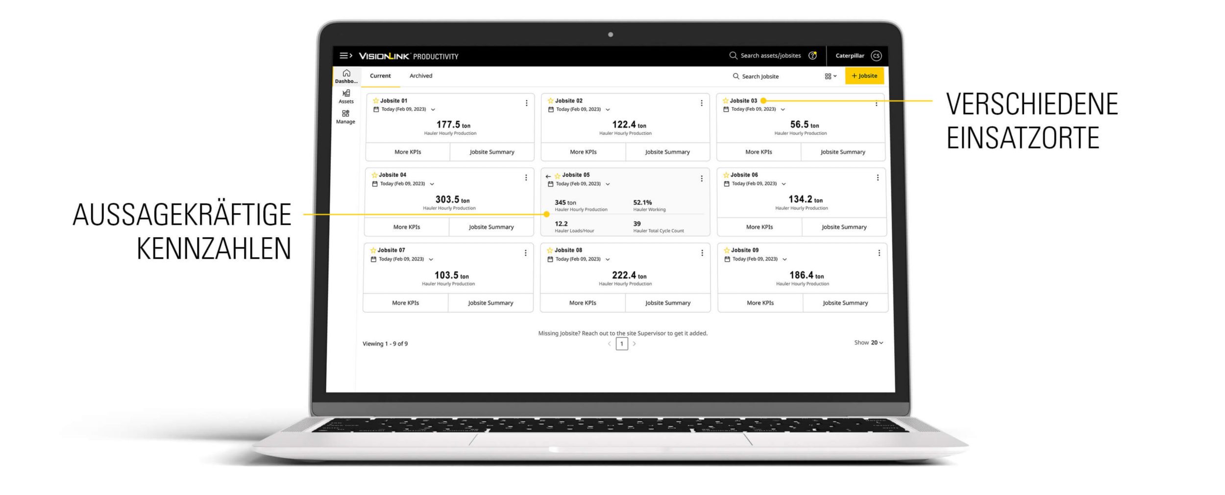 VisionLink® Productivity ergänzt VisionLink mit erweiterten Funktionen. Die cloudbasierte Plattform erfasst und analysiert Maschinen- und Baustellendaten und erstellt ein vollständiges Bild Ihrer Maschinenauslastung und des Arbeitsfortschritts. Ob Steinbruch, Schwerbau, Landwirtschaft, Straßenbau und Abfallmanagement – damit haben Sie jeden Auftrag auch zeitlich im Griff.