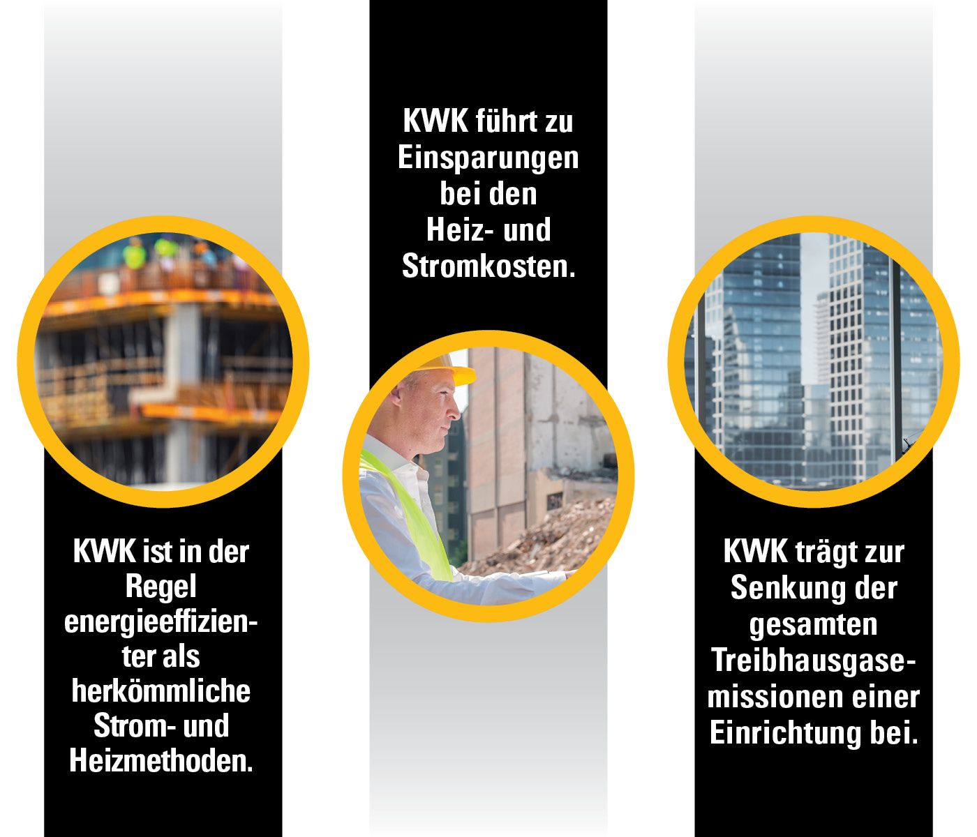 KWK-Lösungen fangen die Wärme von Generatoren auf, die andernfalls verschwendet worden wäre, und nutzen diese Energie für industrielle Prozesse wie die Wärmeversorgung von Gebäuden. So können KWK-Systeme einen Wirkungsgrad von bis zu 80 % erreichen und sowohl die Kosten als auch die Emissionen Ihrer Anlage senken. Möglicherweise gibt es lokale Steuergutschriften oder andere Anreize, die Ihr KWK-Projekt noch erschwinglicher machen können.