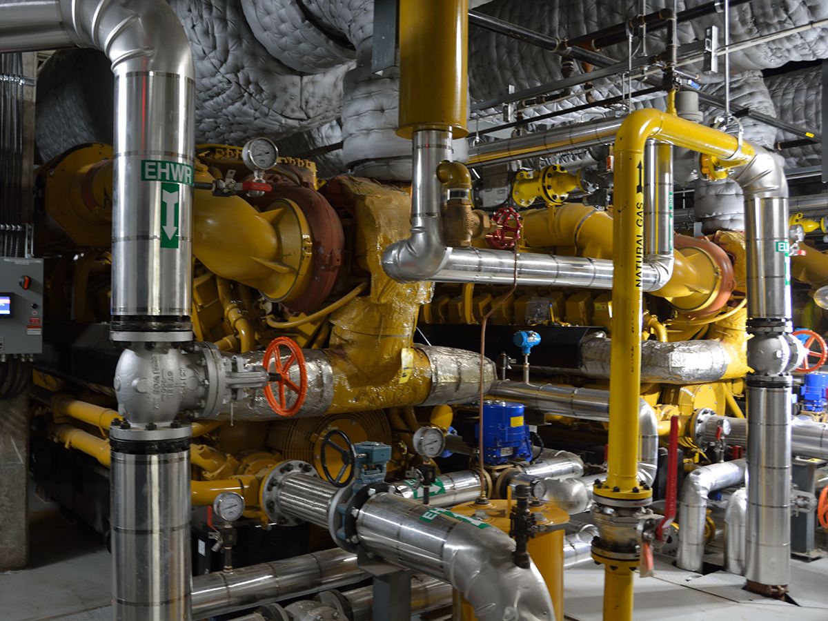 The new CHP system provides HHS with flexibility in how they run the plant. Waste heat from the generators and the exhaust system is captured and utilized to produce steam or hot water for absorption chillers that provide air conditioning during the summer months.