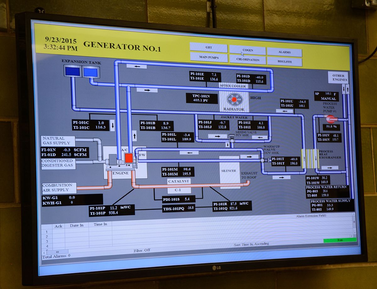The cogeneration plant produces 2.4 MW of power, enough to provide 92% of the power required to run the wastewater plant portion of the facility, and 80% of the power for the entire facility.