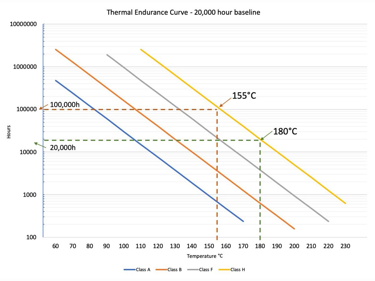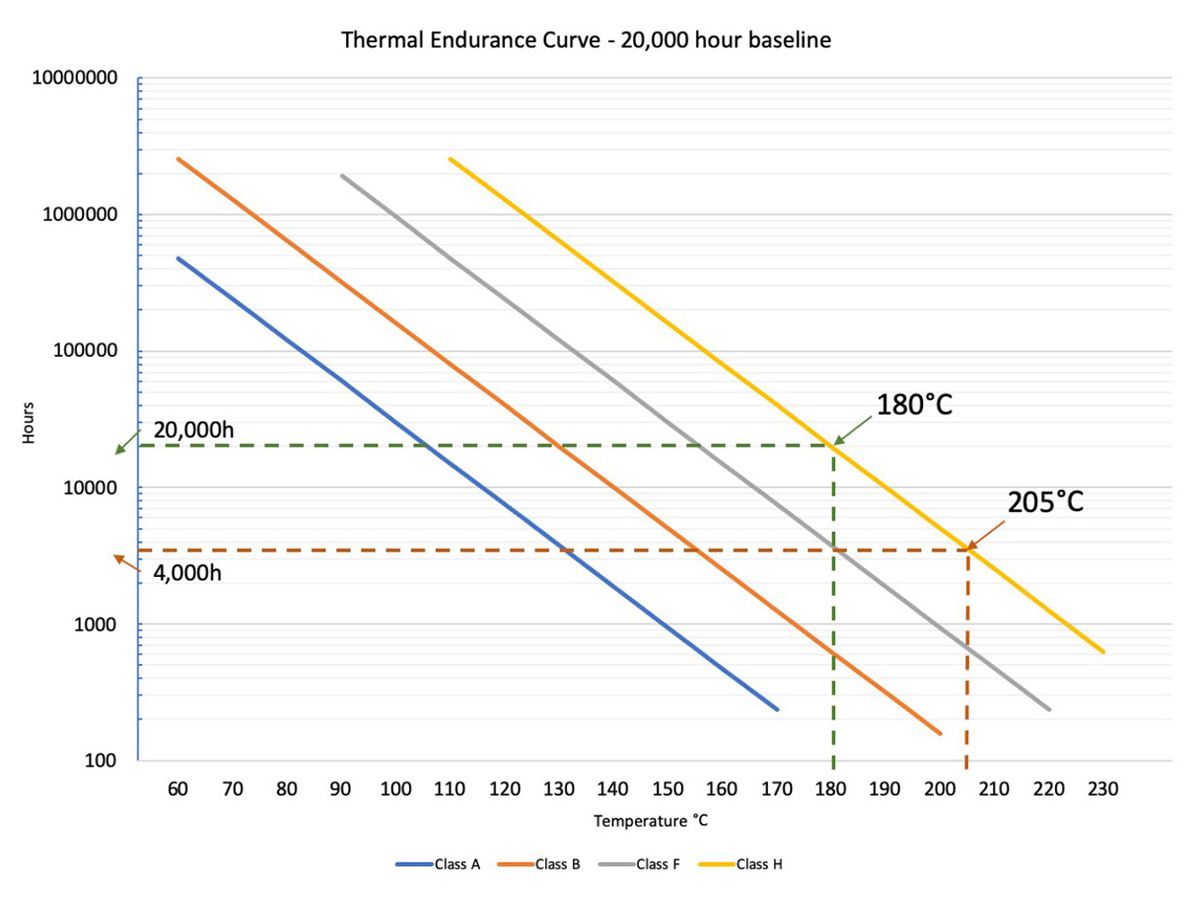 So, what is “suitable thermal endurance”? Thermal endurance is not specifically indicating at what point an insulation system will fail, but more indicating when the thermal breakdown of the material could be expected. There are numerous stresses placed on an insulation system within a generator from Electrical, Thermal, Mechanical and Environmental factors. All of these factors work both independently and together to degrade the overall life of the insulation system and may eventually lead to a failure. The thermal endurance of the system uses accelerated life testing along with real world historical analysis to rate the materials used within the insulation. The materials are typically expected to meet a baseline of 20,000 hours of continuous operation before degradation. From this baseline a Thermal Endurance Curve can be developed using the Arrhenius equation, also known as the Rule of 10. This rule states that for every 10°C decrease in temperature, the insulation life will double. The Thermal Endurance Curve in Figure 2 demonstrates the endurance related to each of the four insulation classes.