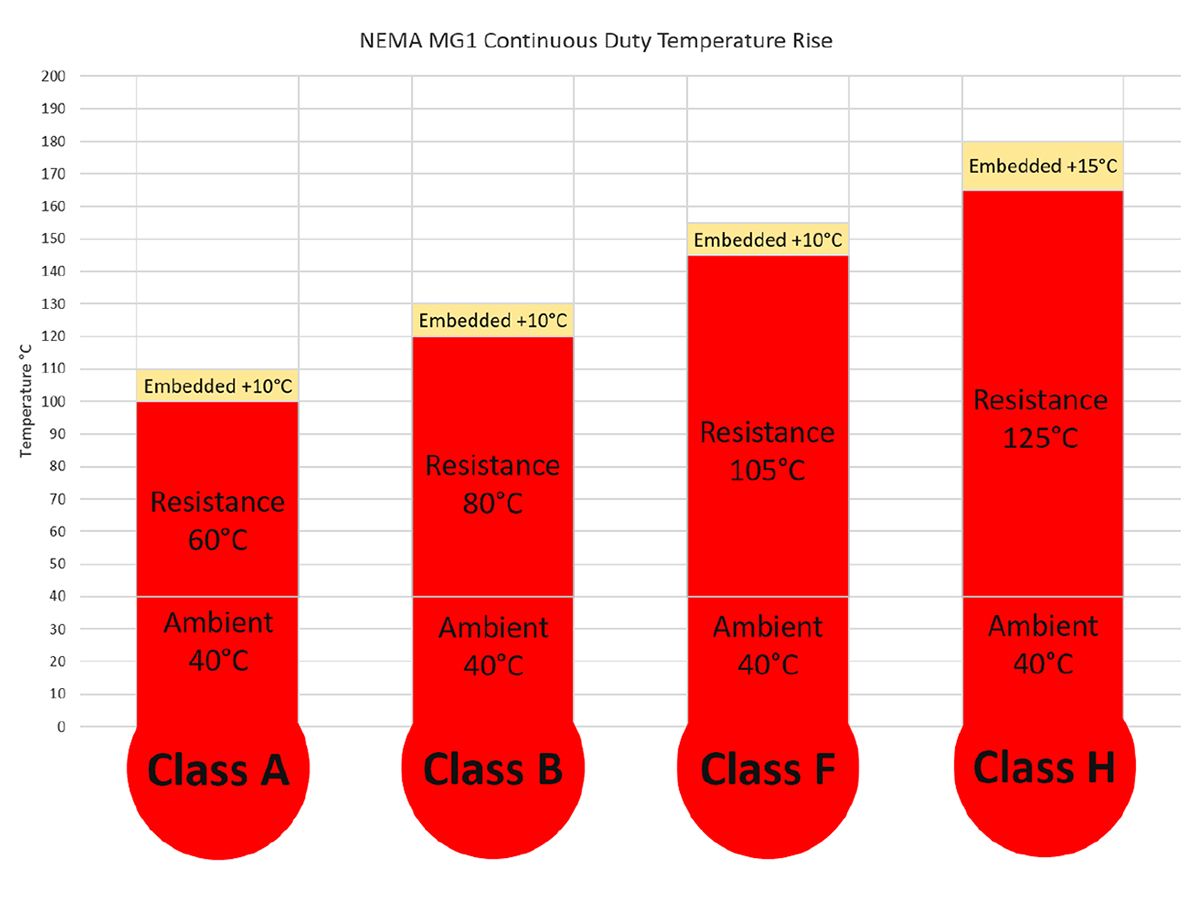 All NEMA MG-1 ratings are based on an assumed ambient temperature of 40°C with allowances provided for variations in the ambient and altitude conditions along with thermal margins based on measurement devices. The chart in Figure 1 displays the total temperature allowable when measured by resistance or with measurement devices embedded in the windings for generators over 1563kVA and 7000 volts or less. The embedded devices provide an additional rise in temperature due to potential hot spots occurring at the measurement location. Figure 1 shows the total temperature for the Class H insulation for continuous duty as being 180°C.