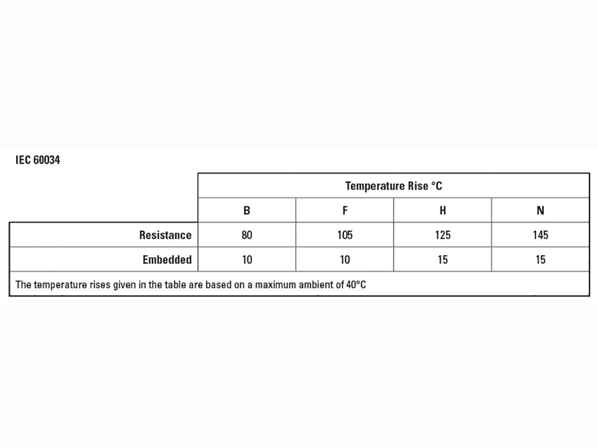 The insulation class and temperature rise of a generator are critical factors that directly influence generator designs and should be considered when drafting requirements specifications. The insulation classification of the generator will determine the materials used to insulate the generator and when combined with the temperature rise targets will provide an expected thermal endurance of the generator. A customer can use this information to generally predict the scale of expected life related to thermal wear and develop an equivalent baseline between products from different manufacturers.