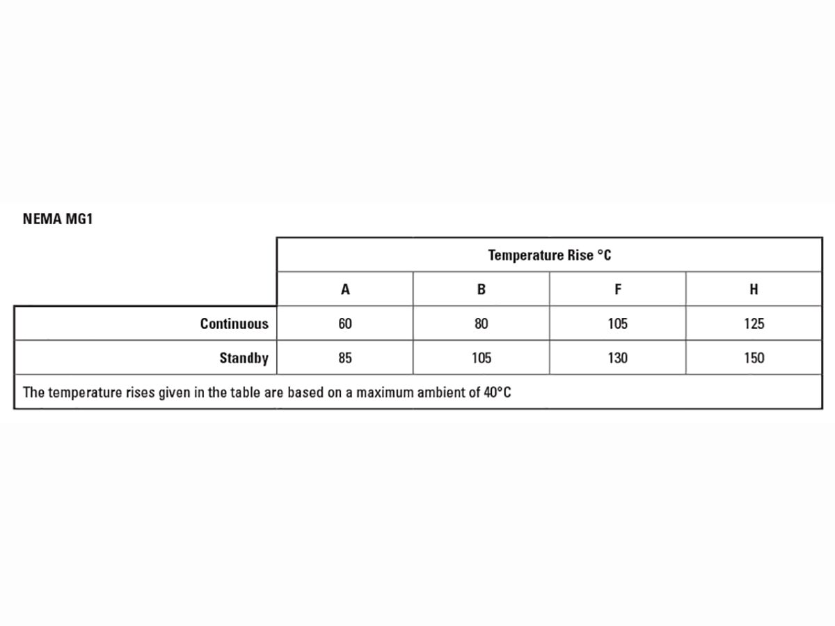 The allowable temperature rise, as measured by resistance, for each classification is shown in Table 1 for continuous operation along with the ratings for Standby operation, which provides for an additional 25°C rise. The standard defines Standby operation as applications where the generator is an emergency back-up power source.