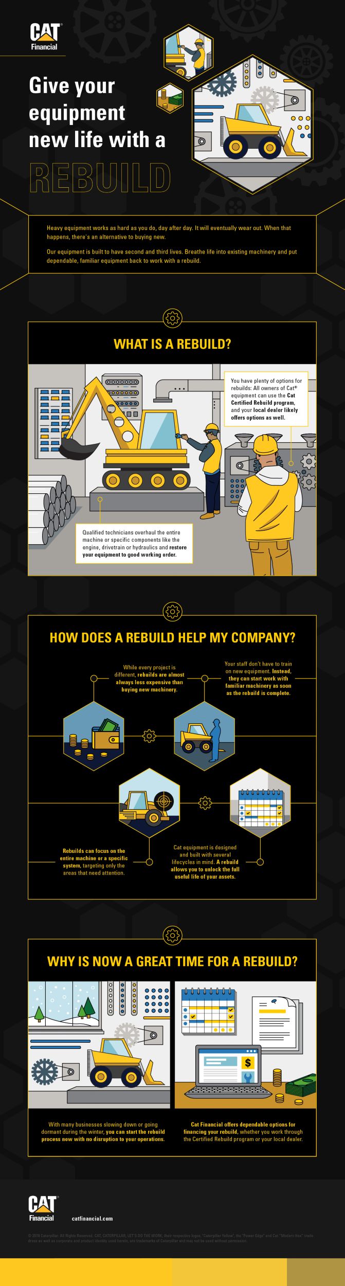 Every rebuild is unique to the business and piece of equipment involved, but the major benefit of this process is a cost-effective alternative to buying new equipment. Because Cat machinery is designed with more than one functional lifecycle in mind, a rebuild can be an especially good decision in terms of both productivity and finances.