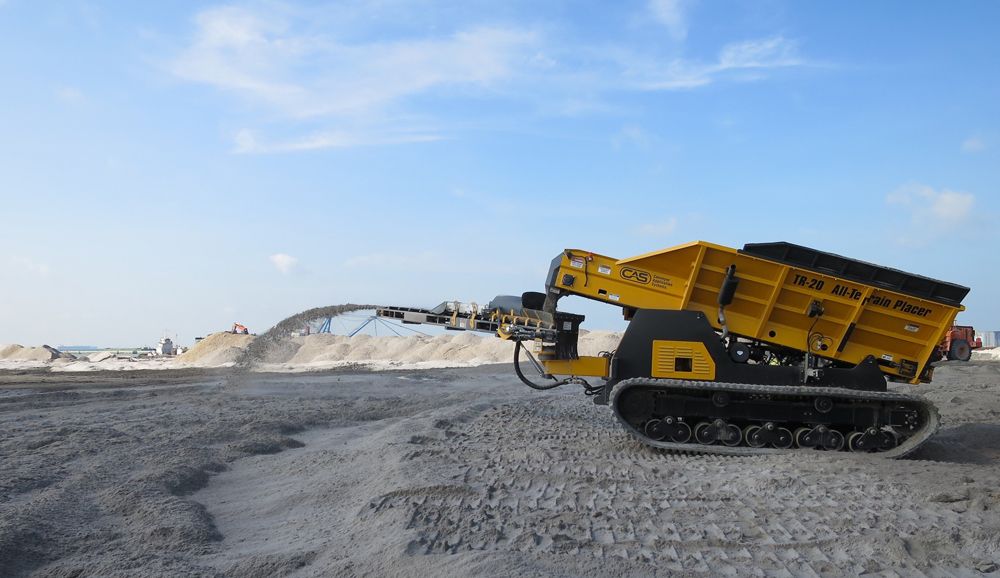 The most popular CAS Slinger is the AT7, a four-wheel-drive, all-terrain vehicle that’s operated via the operators’ wireless remote control. Because it’s unmanned, it’s perfect for safely placing material in hard-to-reach areas that might otherwise put operators at risk. CAS All-Terrain Slingers can place up to nine yards of material per minute or sling it as far as 150 feet in distance. Materials such as rock, soil, mulch and concrete to name a few are no match for CAS Slingers. The AT7’s twin-on-tracks, the TR20, is nearly identical in every way — with the exception of its low-ground-pressure tracked platform. Emitting a mere 4-7 pounds per square inch (psi) of ground pressure as it travels, the TR20 is ideal for jobs on soft terrain like sandy beaches, wetlands or on sloped areas.