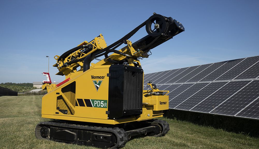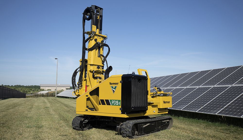 The ground-mount solar market is divided into two segments: large utility operations that supply power to the grid, and smaller community or distributed operations that provide power at the point of use — for example, a university that builds a solar field to power its campus. Vermeer expected the new PD5 and PD5R pile drivers to appeal to contractors who serve smaller operations, since they typically own one or two pile drivers and need a machine that’s small, lightweight and easy to transport from site to site. But the company has been pleasantly surprised at the interest from larger contractors as well. “They might have 30 or 40 pile drivers running on one job, and they love the fact that they can haul four of ours on one semi,” Savage says.