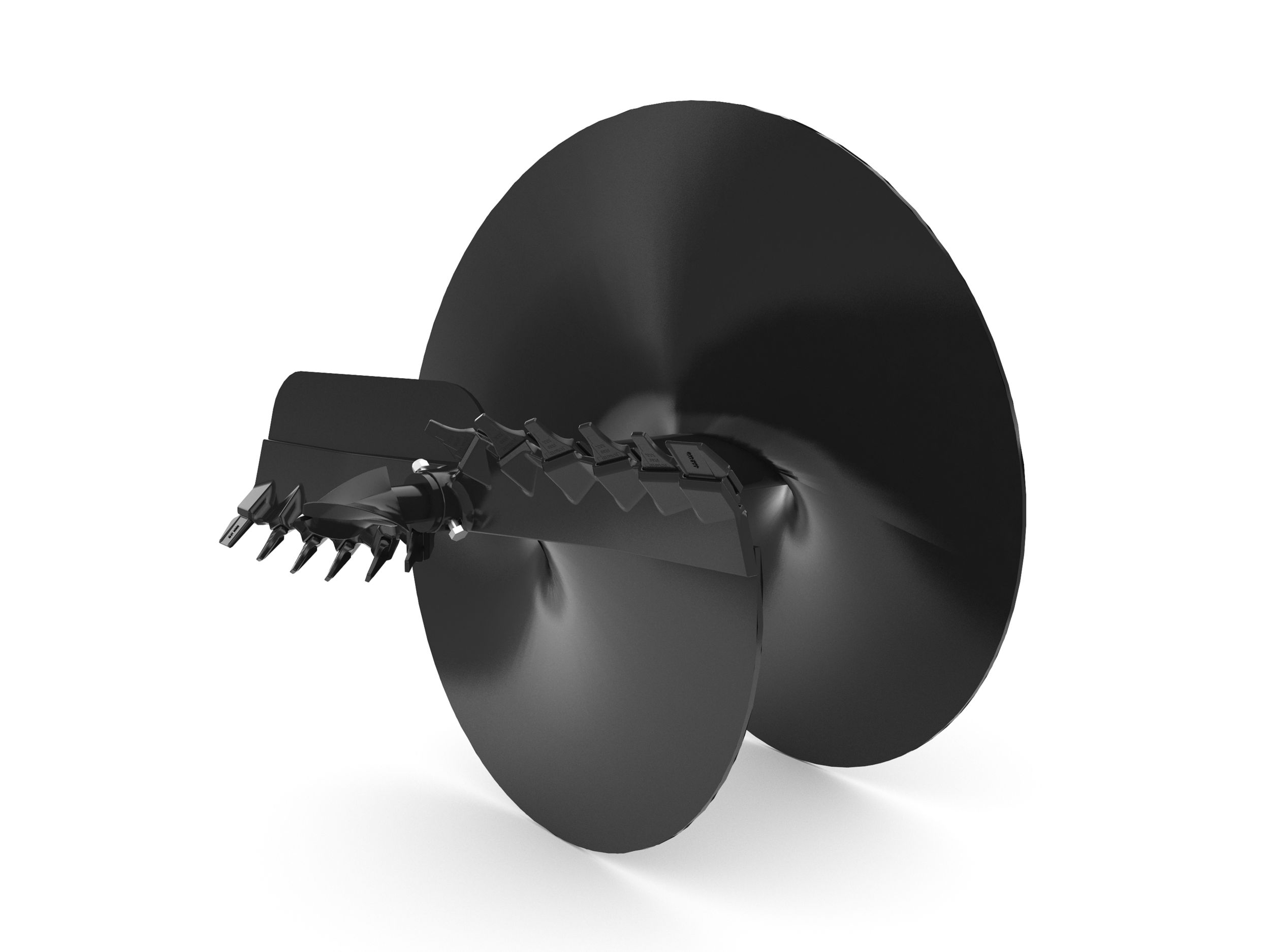 Standard rock drill head has an enlarged shoulder to increase holder protection protect the connection for use in solid fracturable rock and high impact soil. A variety of auger flights are available to handle various ground conditions. Gage teeth for the outer station and flat and/or chisel teeth for the inner stations. Flights are available hard faced or carbide to handle abrasive soil and compacted rock.