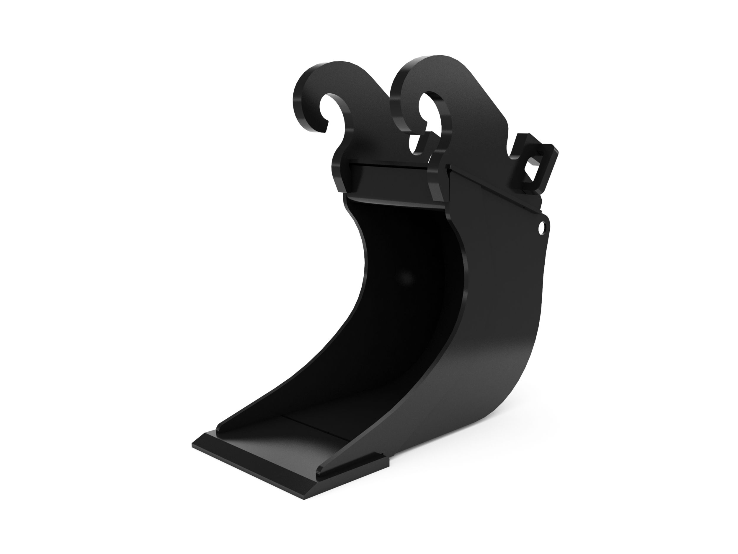 Open side plates and small width are the main characteristics for a banana style trenching bucket. Specific for trenching cohesive materials for easy unloading.
