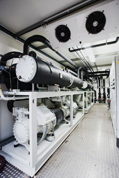 At the Eric van den Eynde Greenhouse in Kontich, Belgium, 95 percent of the electricity generated is sold to the local electric utility based on the premium paid for high-efficiency power. The jacket water, exhaust, first stage aftercooler, and oil cooler heat from two G3516A (1,070 ekW each) generator sets and one G3520E (2,070 ekW) gas generator set are captured and stored in the form of hot water. The hot water is used to stabilize the greenhouse temperatures. Water with a temperature of up to 95° C (203° F) is stored in a 1,200 cubic meter (1,569 cubic yard) tank which acts as a thermal battery. The tank provides hot water at 45° C (113° F) via metallic tubes in the greenhouse. The temperature is maintained between 19° and 21° C (66° to 69° F) throughout the year.