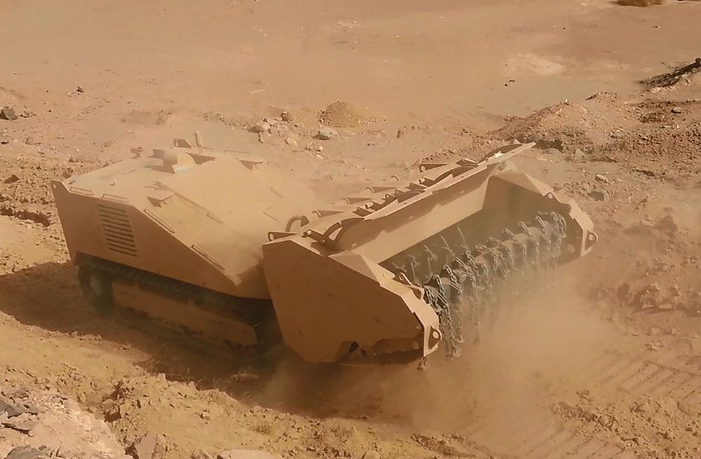 Powered by a Cat® C18 industrial engine, the MV-10 is constructed with military-grade armor, so it can withstand anti-tank mine blasts without sustaining damage. The operator is positioned up to safe 1500 meters (more than 650 feet) away from the action, using remote control to maneuver the machine and a video monitor to track its progress.