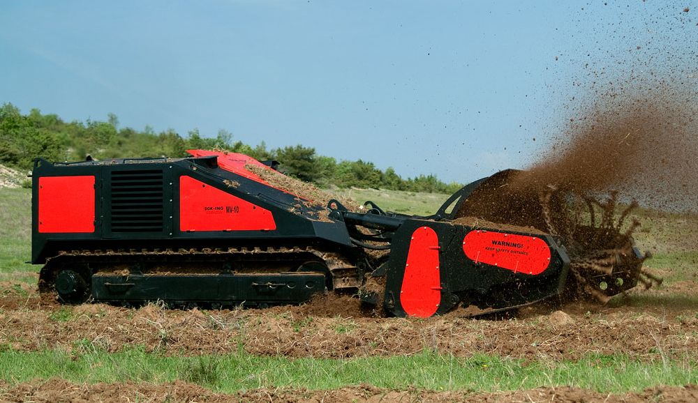 DOK-ING’s premier mine-clearing system, the MV-10, uses a rotating flail/tiller tool to break up or detonate land mines: The flail works on the ground to destroy vegetation and surface mines, and the tiller digs deep into the ground to destroy buried mines. The two tools working together allow the MV-10 to clear a site faster than competitive products, which only use a flail or a tiller, not both.