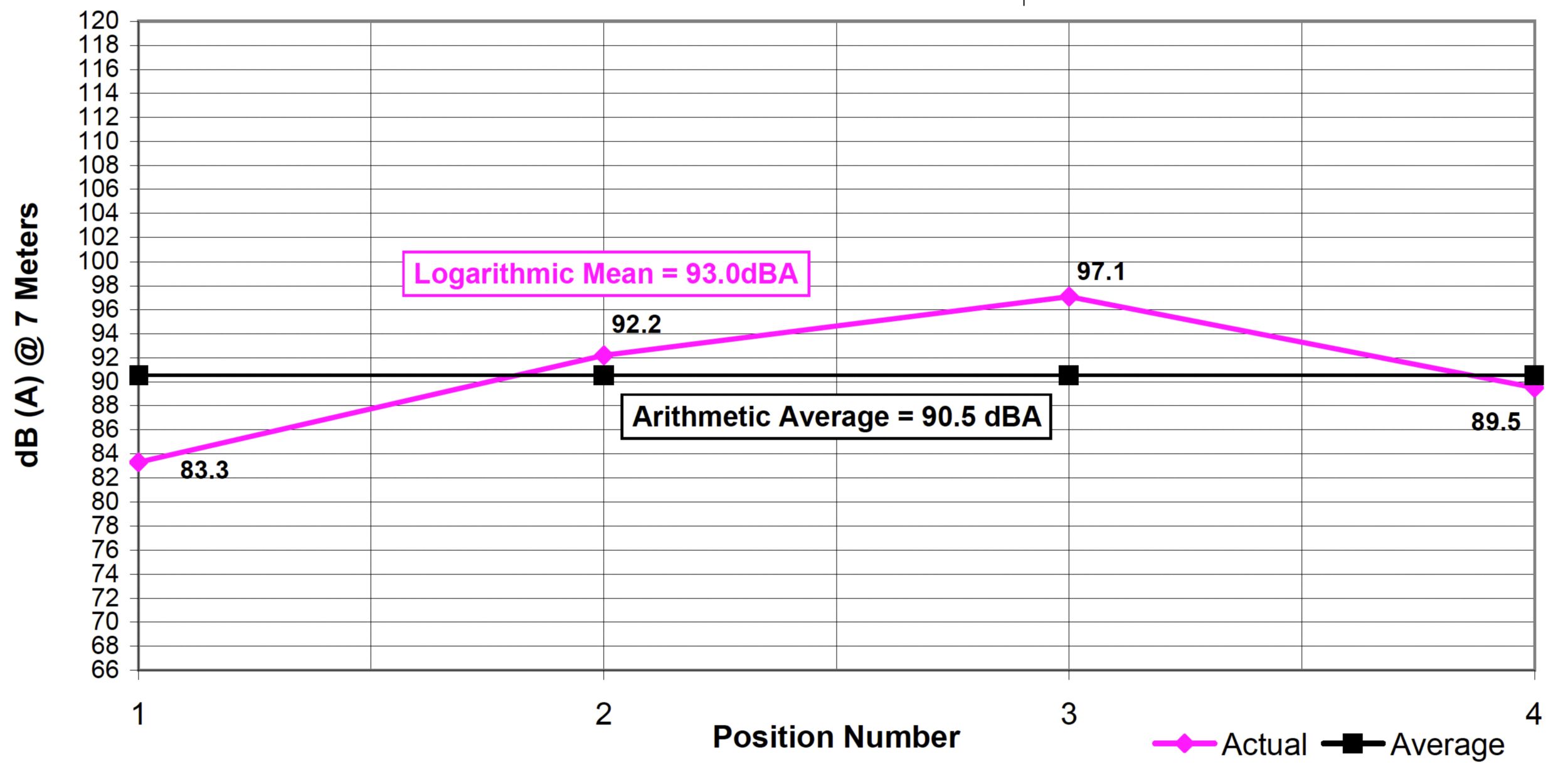 As shown, measurements were taken from four positions (front, back, left and right) and the logarithmic mean is calculated at 93.0 dBA at seven meters.