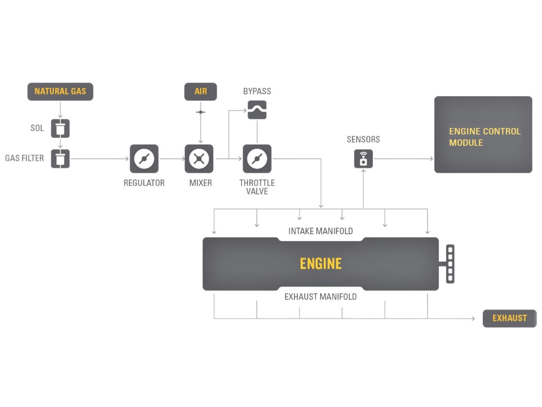 Controlling the engine with modern microprocessor-based technologies—like the Electronic Control Modules (ECM) managing the microprocessor-based throttle and the air-fuel ratio control pushing pre-mixed air and gas into the engine cylinders and ignition, providing constant feedback to the ECM by NOx, temperature and pressure sensors—makes the lean burn engine gas management system more reliable than ever. With air-gas mixer systems, standby and demand response applications with lean burn engines can achieve 100% block loads while meeting NFPA requirements.