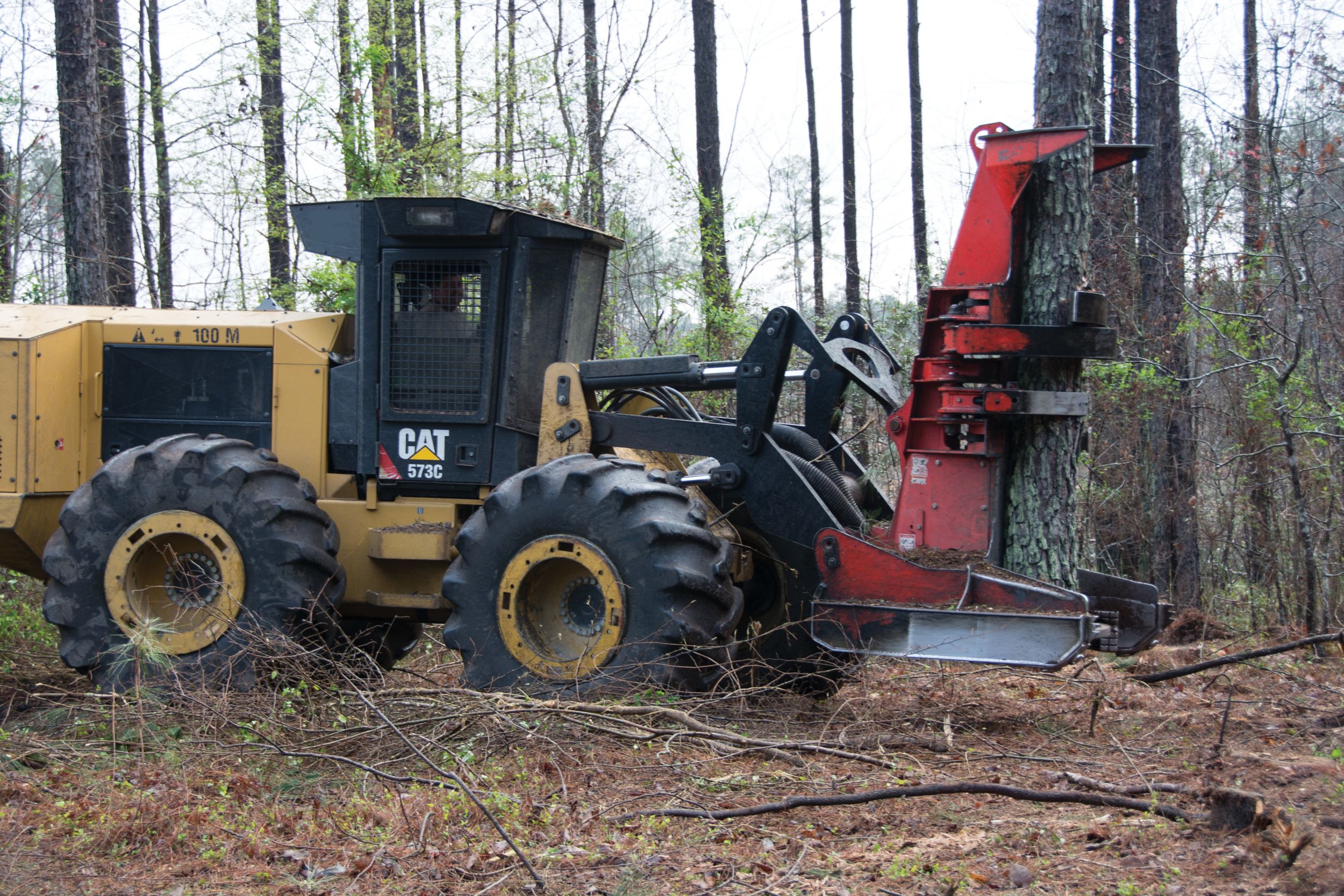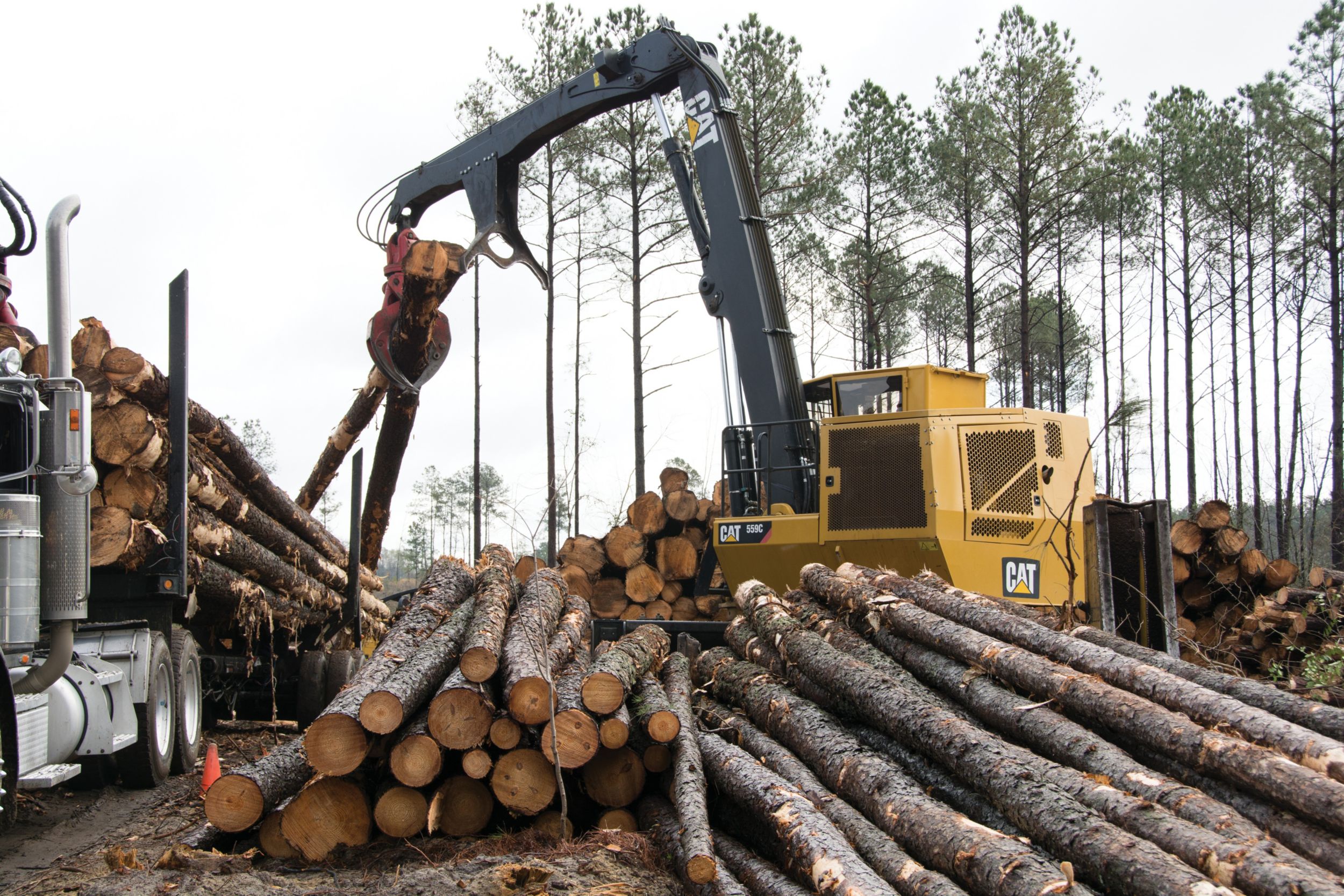 And McClam is still working. At a clear-cut of a 200-acre tract, a Cat® 559C Knuckleboom Loader sorted logs into two groups: Those that were 18-inches and above at the butt with 8-inch tops, and logs with 8-inch butts and 5-inch tops. The loader has the capacity to keep pace with an added truck, and the ability to easily lift trees with butts wider than 18 inches.