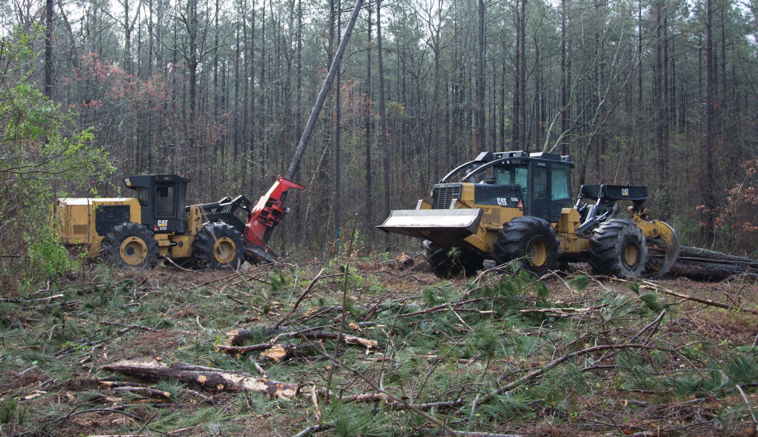 Deeper in the woods, a Cat 573C Feller Buncher cut down trees, which were transported to the knuckleboom loader by a 535D Skidder and a 525C Skidder. The skidders have the stability and power to pull full loads up the site’s steep and rugged inclines.