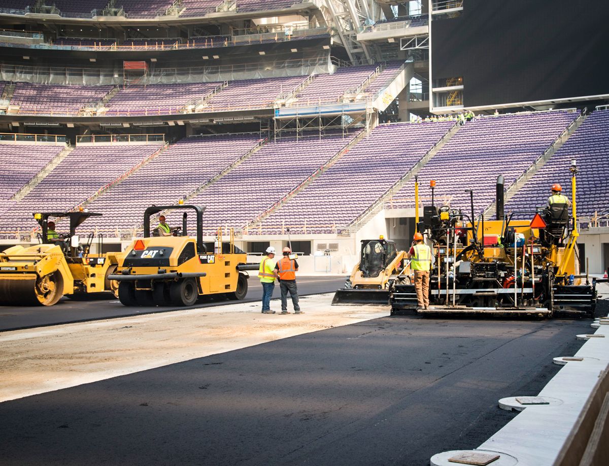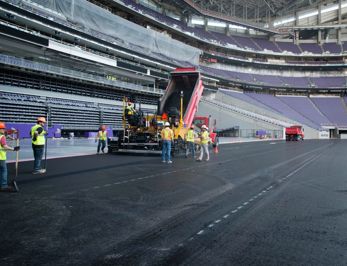 High fives and handshakes celebrated a victory four months before the opening kickoff of the 2016 NFL season at US Bank Stadium in Minneapolis. The reason for the cheering? The paving crew had met the demanding flatness specs set by the NFL for the stadium bowl’s asphalt base.