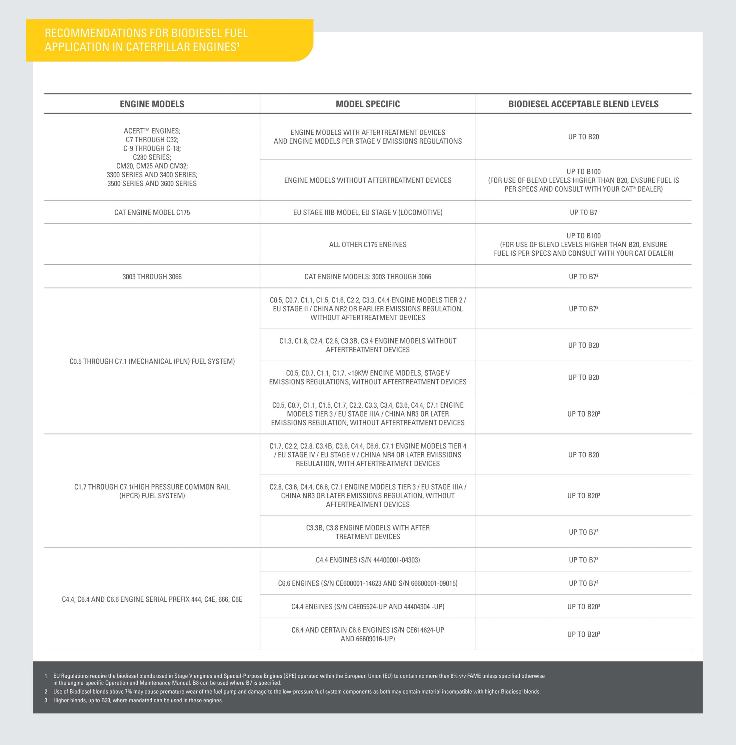 This chart shows which biodiesel blend levels are acceptable for use in Cat engines.