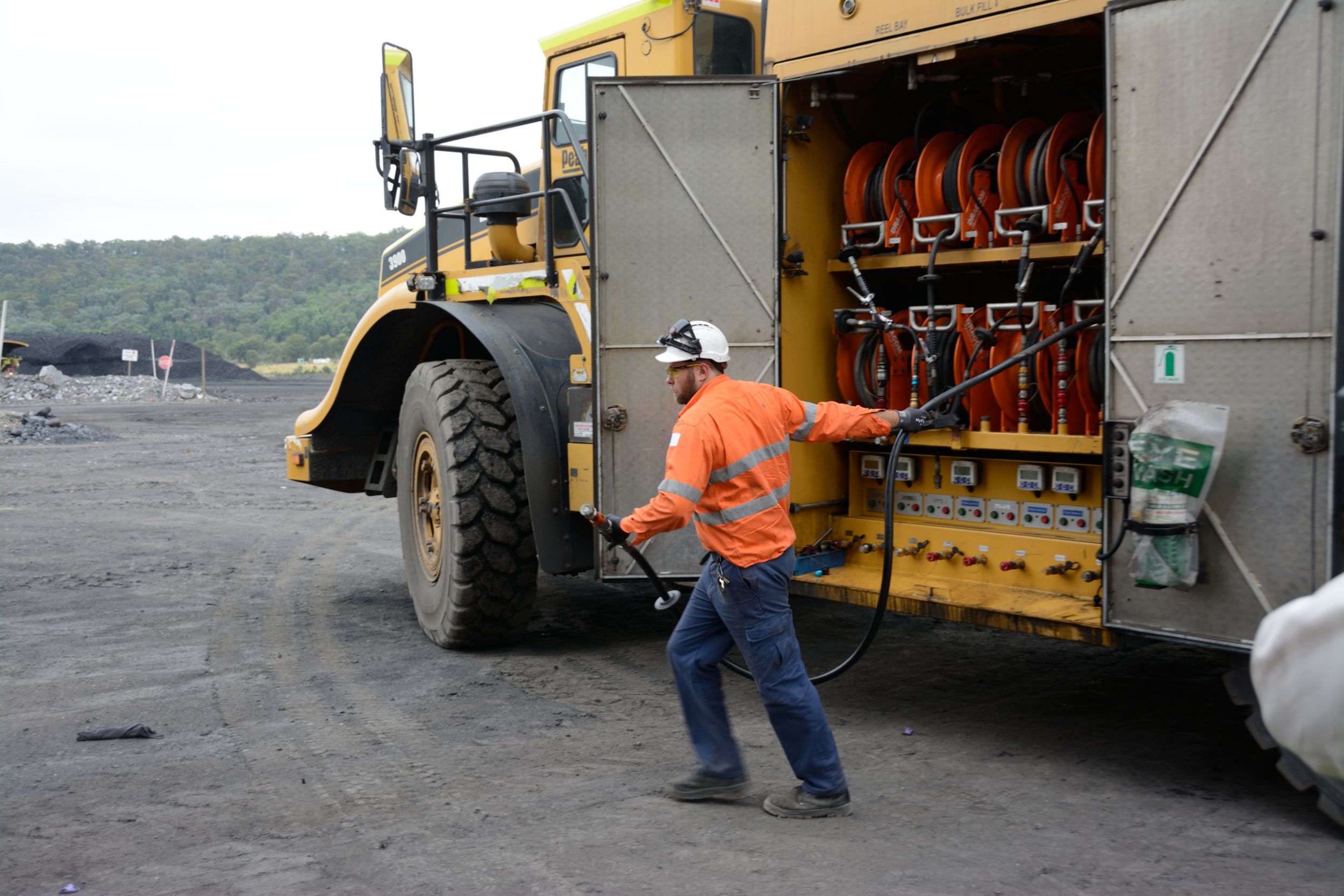 The Haulmax 3900 support trucks with Bard service modules move throughout the widespread work areas to refuel machines and provide the necessary fluids and lubricants to ensure all heavy equipment is fully serviced and ready to operate for each shift during the mine’s around-the-clock operation.