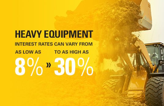 In general, heavy equipment interest rates can vary from as low as 8% to as high as 30%. However, limited-time promotions can help decrease the rate at which you are financing equipment. Special offers are typically offered to qualified customers for: