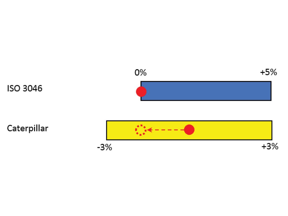 Caterpillar vfc data is therefore more conservative and not directly comparable with that of a manufacturer quoting ISO 3046-1. To make a fair comparison, the Caterpillar vfc data can be adjusted to report new data with a +5% tolerance. Figure 1 below shows the fuel tolerance comparison graphically with the reported value represented by a red dot.