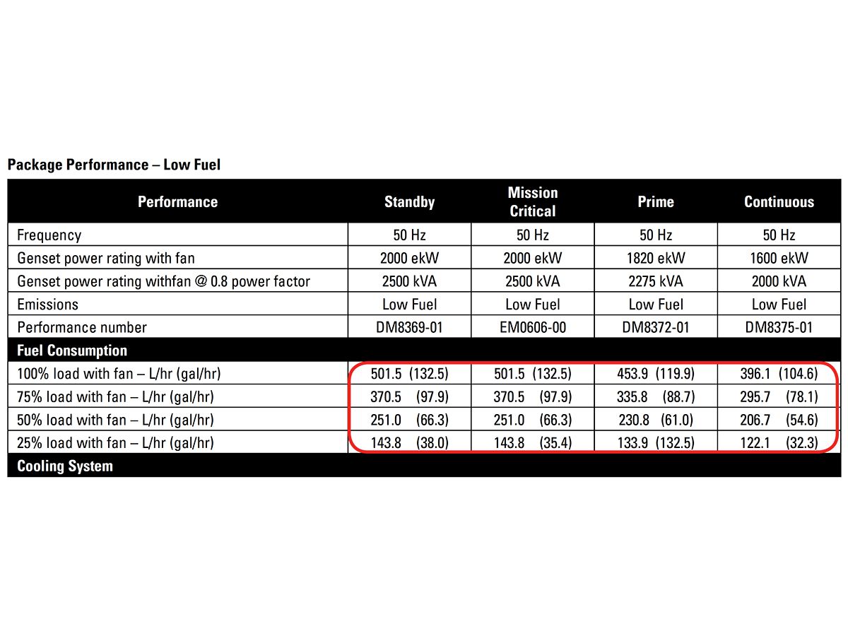 The equation above shows that vfc data shown on a Caterpillar spec sheet can be multiplied by 0.96814 to give data which is comparable to other manufacturers quoting the ISO 3046 standard. Note from Figure 1 that the adjusted Caterpillar vfc still has potential to be better than the reported value due to the larger tolerance band. As an example, the fuel consumption data from a 3516B generator spec sheet is shown in Figure 2.