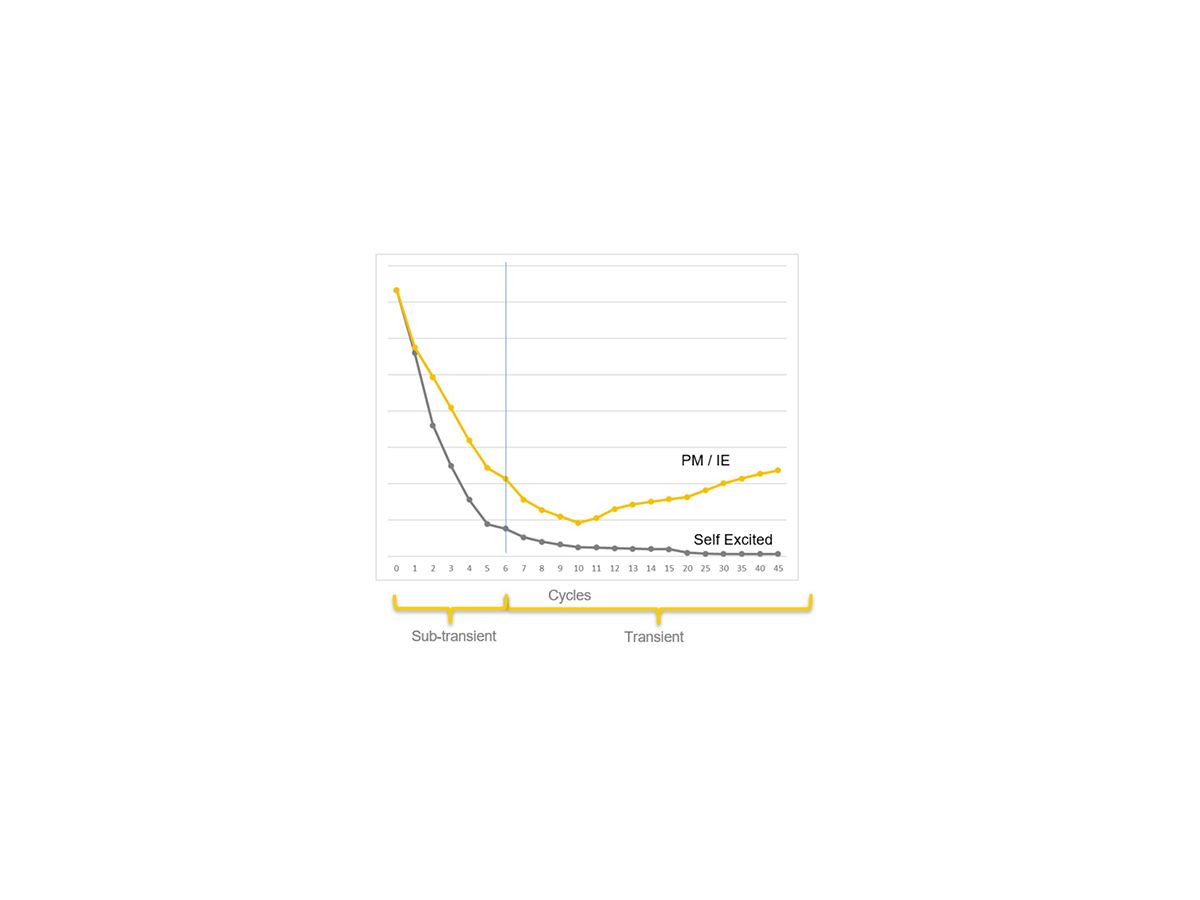 During the first six cycles following the event, the generator set is limited by sub-transient reactance and excitation generated from the voltage regulator. Generator sets with voltage regulators that receive power from the output of the generator set (Self Excited, SE) will reduce the current quickly, while generator sets with an external source for power (Permanent Magnet, PM or Internally Excited, IE) will reduce the current at a slower rate as displayed in Figure 1.