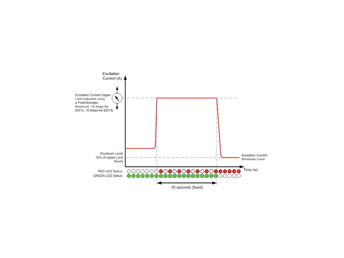 In the event of an overcurrent condition, the excitation current will increase rapidly, known as “field forcing.” The Excitation Module will limit the field forcing current to the defined upper limit within the design guidelines outlined for the Cat generator set, typically 300 percent of rated current for a fixed period of 10 seconds.