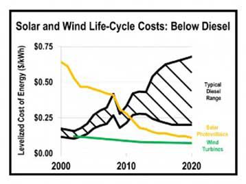 The concept has become increasingly attractive as the cost of energy from wind and solar photovoltaic generation has declined. Conversely, the cost of diesel fuel – usually the most available fuel for remote locations – has risen, as shown in Figure 2. In 2000, the levelized life-cycle energy cost of wind generation was similar to that of diesel, while solar energy was nowhere near being competitive.