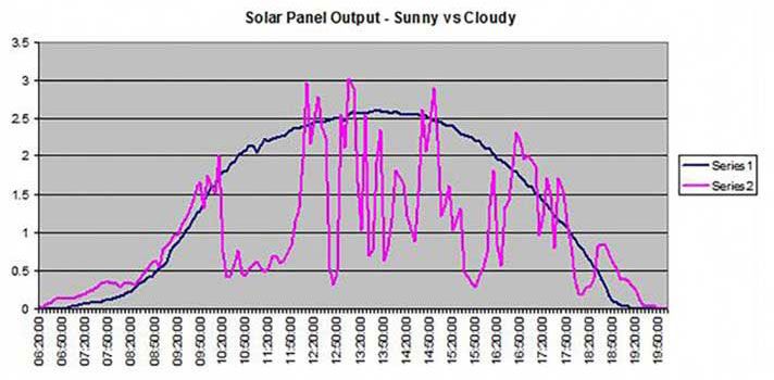 The system readily compensates for fluctuations in output from the solar panels. Figure 5 compares solar photovoltaic output for the array on a clear day and a cloudy day. During cloudy periods, solar energy generation can vary from 50 to 100 percent of the array capacity over short periods of 10 seconds or less. A sharp drop in photovoltaic output causes a sharp rise in the power required from the diesel generator sets. This causes a drop in system frequency and voltage as the diesel generators respond to the load.