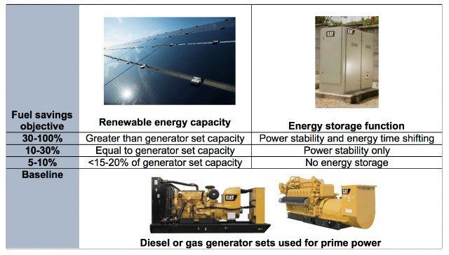 Optimally, renewables would total the full 3 MW or more. In that event, under ideal wind or sun conditions, the renewables could carry the entire load and at times inject the excess energy into storage for use later when wind or sun conditions are less favorable. This would result in long periods where no fuel is consumed from running the generator sets.