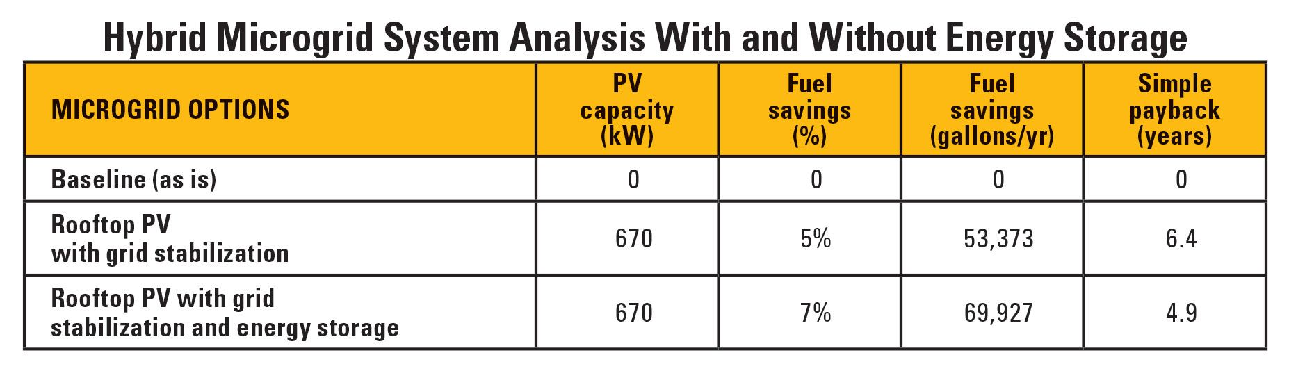 The analysis results showed a six-year payback simply from combining photovoltaic with the diesel. The payback fell below five years with the integration of a 250 kW energy storage system, even though that system would result in a higher total capital expense.
