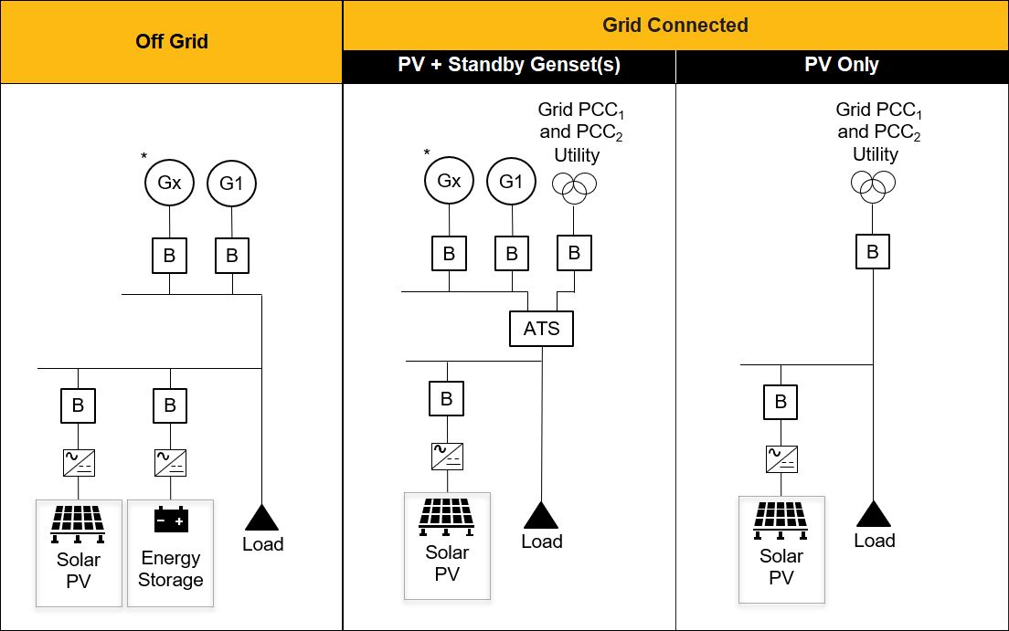 (*) - Paralleling genset controllers (Cat® ECS 200, EMCP4.4) or paralleling switchgear required.