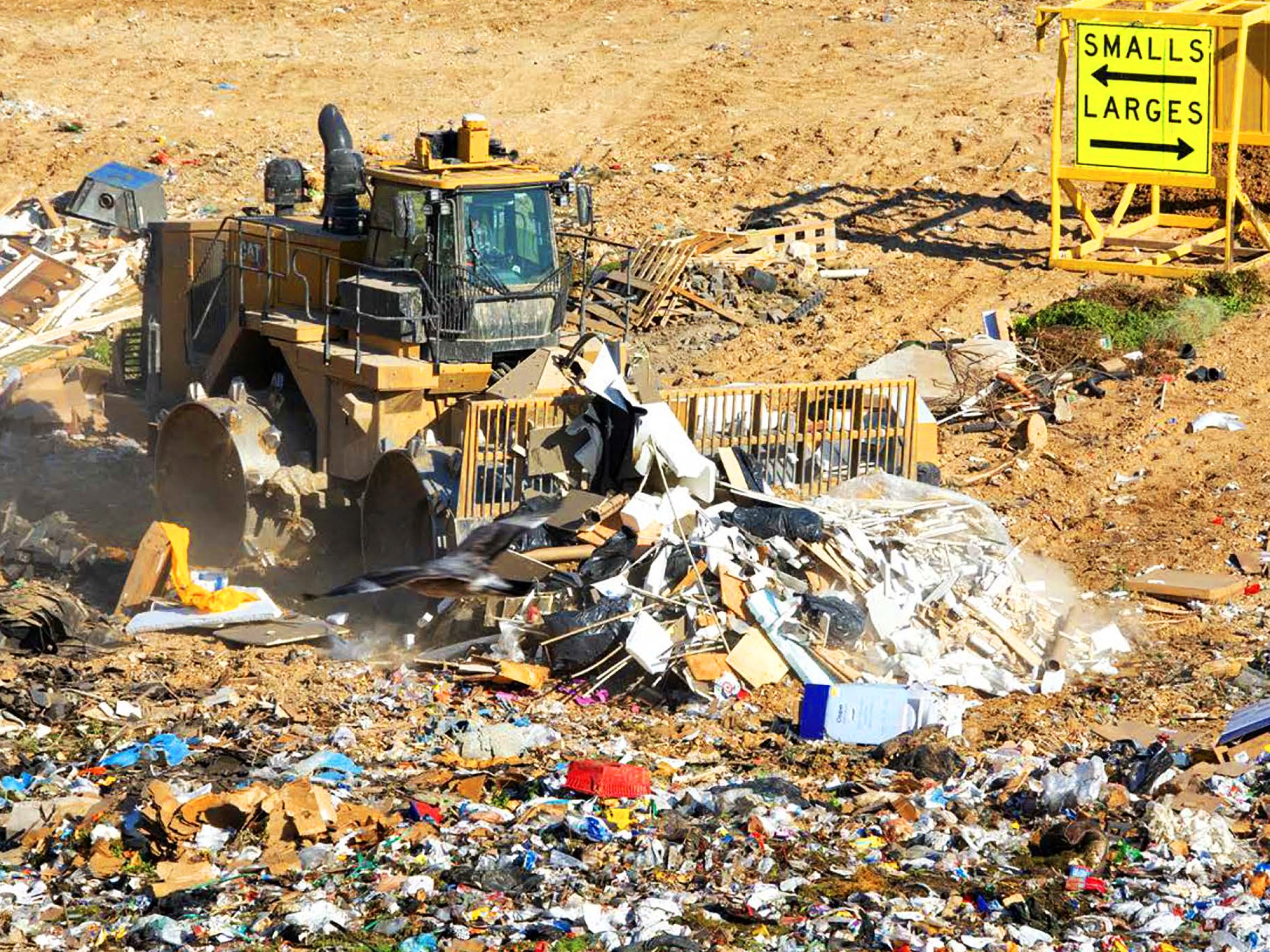 When it's time to cover the landfill cell with dirt, a 349 hydraulic excavator loads up 740 and 745 articulated trucks to haul the dirt to the compacted waste. A D9 dozer will then top all the waste with 18 inches of dirt to be graded with a Cat D6 XE dozer.