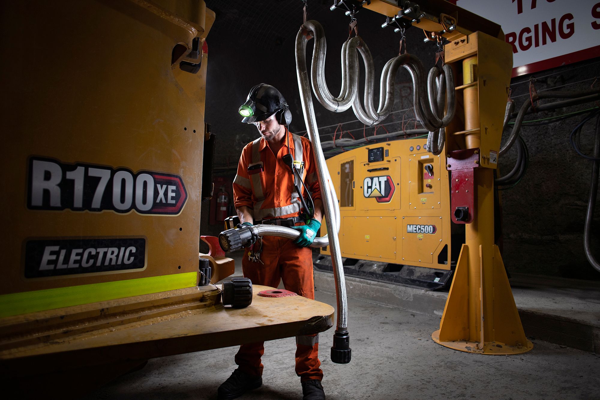 The R1700 XE is Caterpillar’s first underground battery-powered, zero-emissions machine, producing less heat, noise and vibration. It’s also the first in the industry to provide onboard fast charging, which eliminates the need to handle or exchange batteries. Charged by the Cat MEC500 Mobile Equipment charger, the R1700 XE can be charged in less than 20 minutes when using two chargers in tandem.
