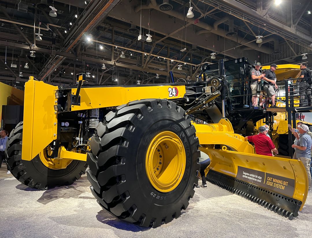 Caterpillar brought its largest motor grader — the 24 — to MINExpo. It was equipped with a 28-foot moldboard, which eliminates a pass when supporting ultra class trucks. It also featured the High-Performance Circle, a retrofittable or factory installed feature that increases performance and extends drawbar life.