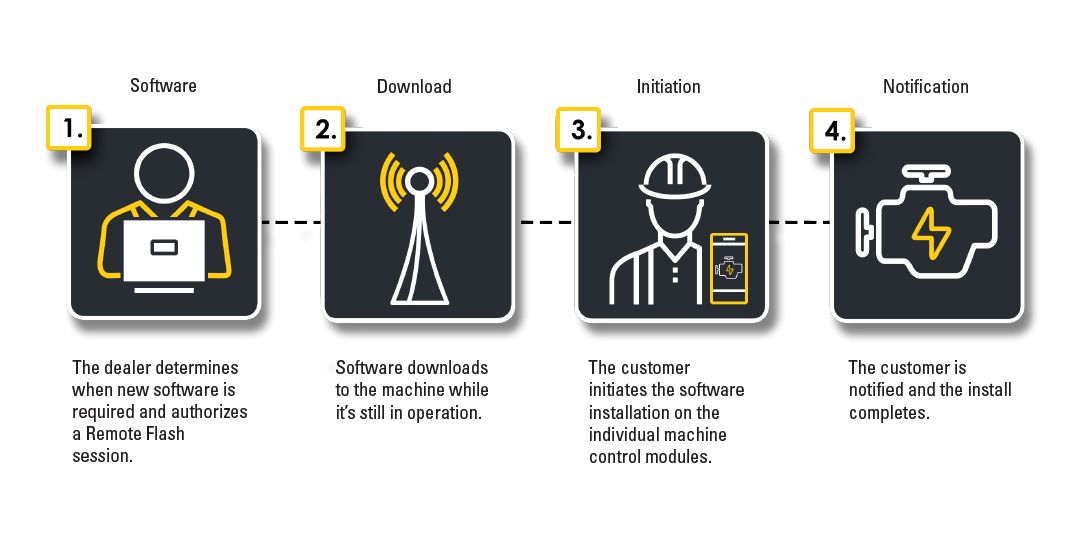 Cat Remote Flash enables your Cat dealer to send most Electronic Control Module (ECM) updates directly to your assets, no matter where they are, without interrupting operations and with no site visit required.