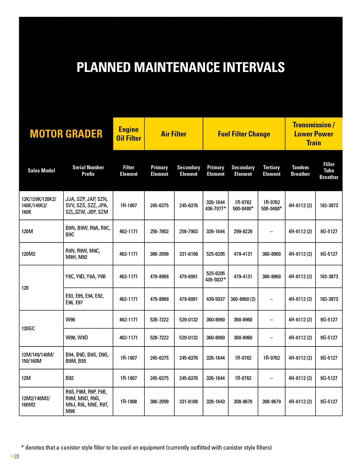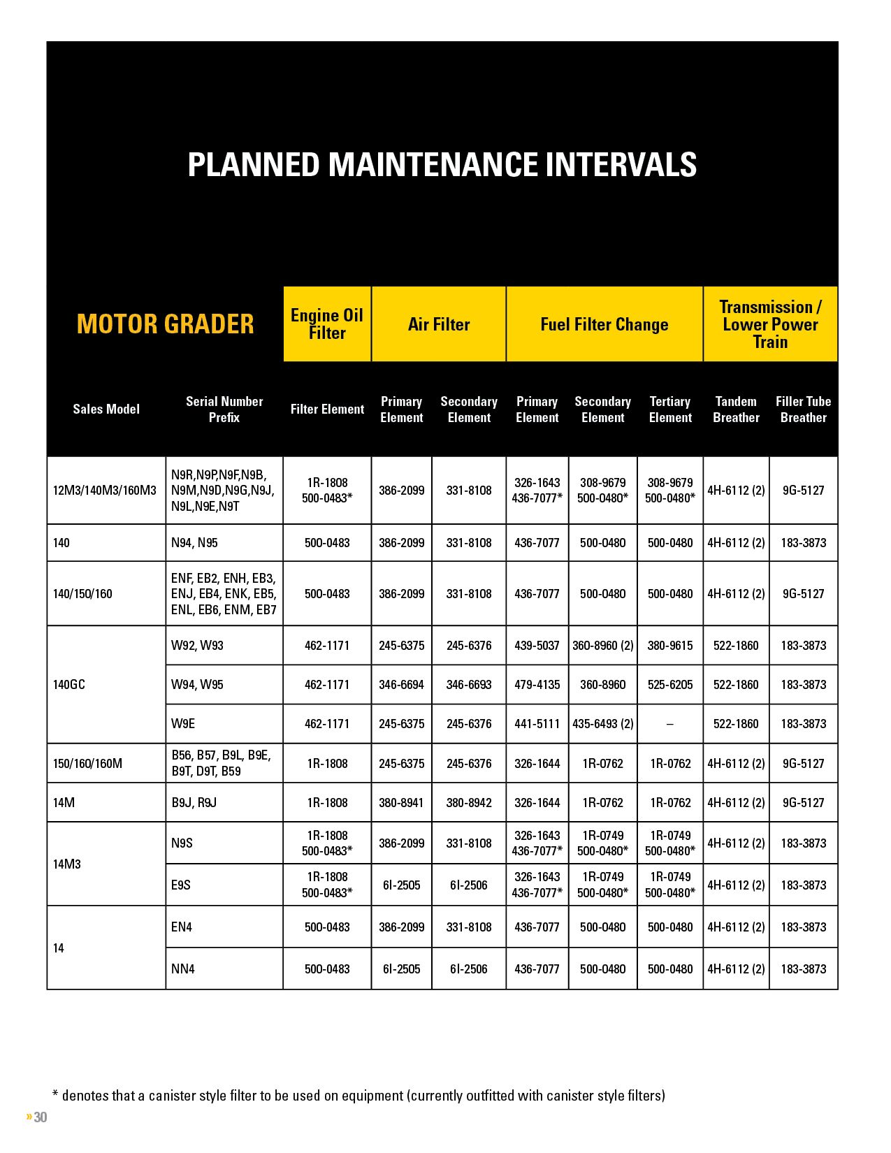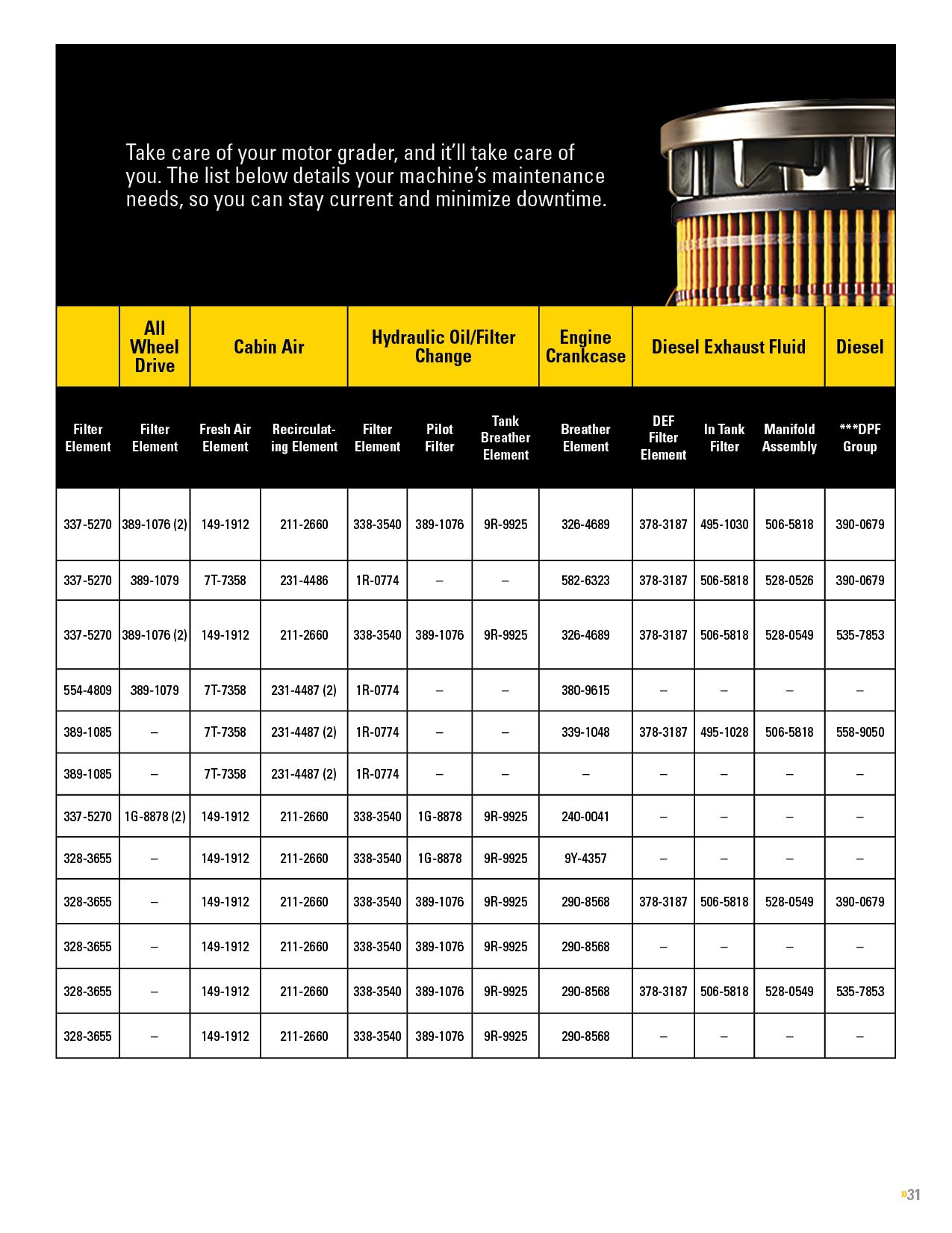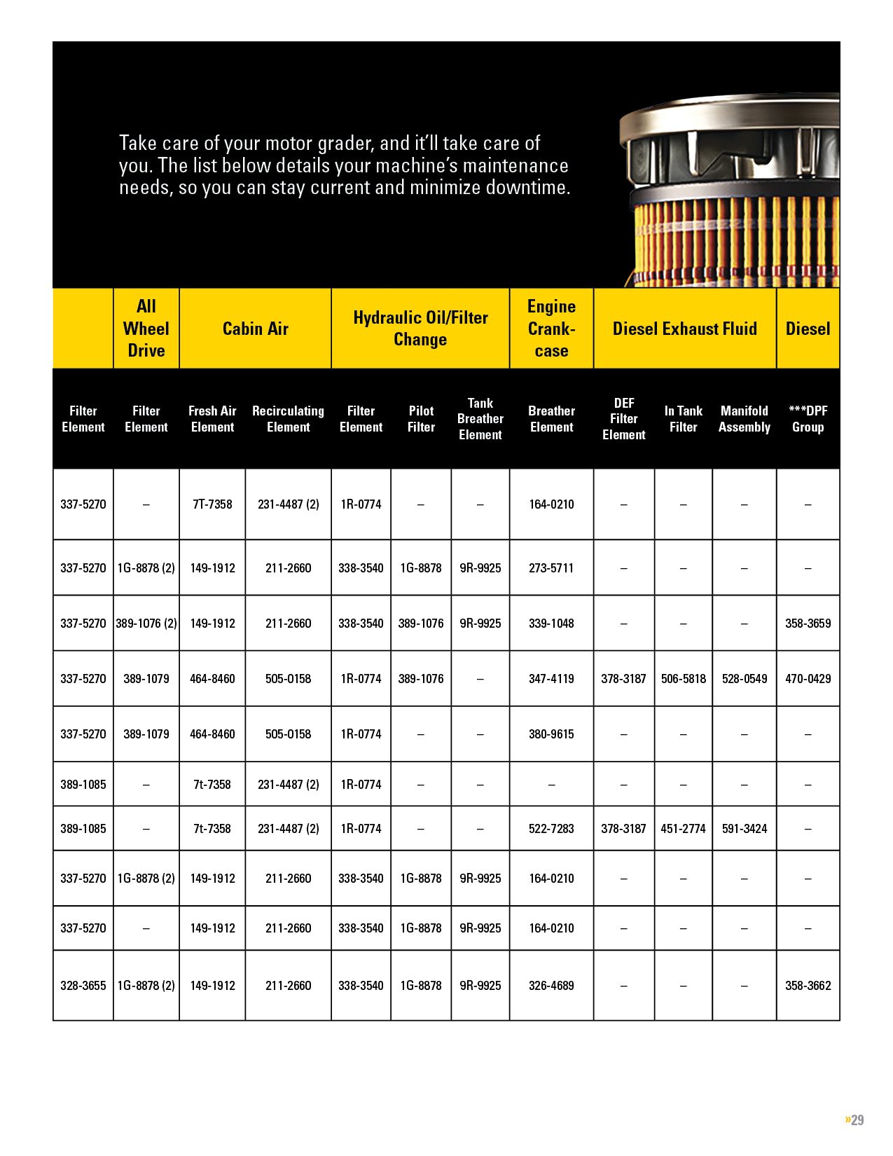 Take care of your motor grader, and it will take care of you. The list below details your machine's maintenance needs, so you can stay current and minimize downtime.