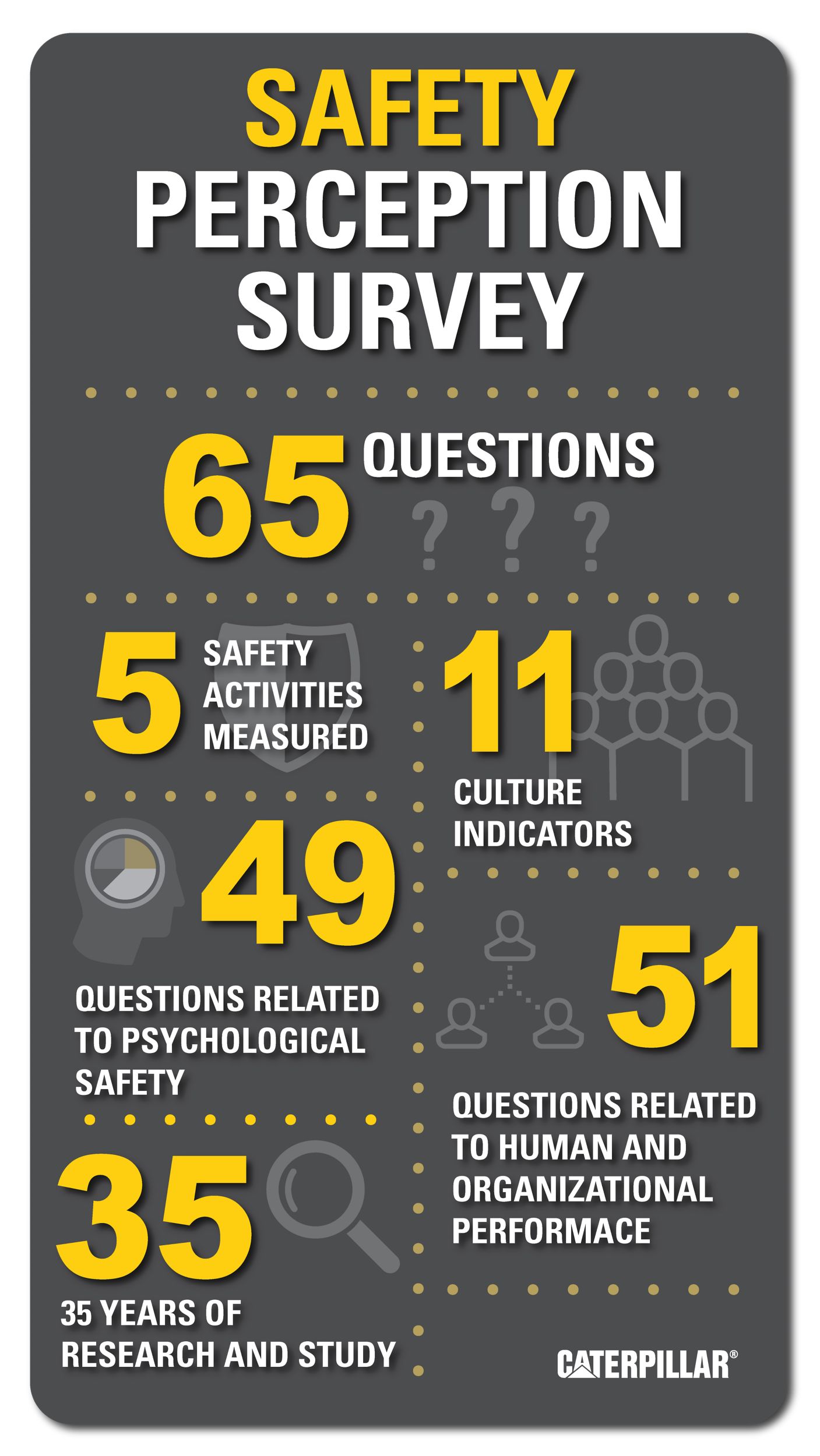 The Caterpillar Safety Services Safety Perception Survey analyzes an organization's safety culture. Building on 35 years of research and study, the new Safety Perception Survey updates language and modern concepts of safety culture excellence, adding questions related to psychological safety and human and organizational performance.