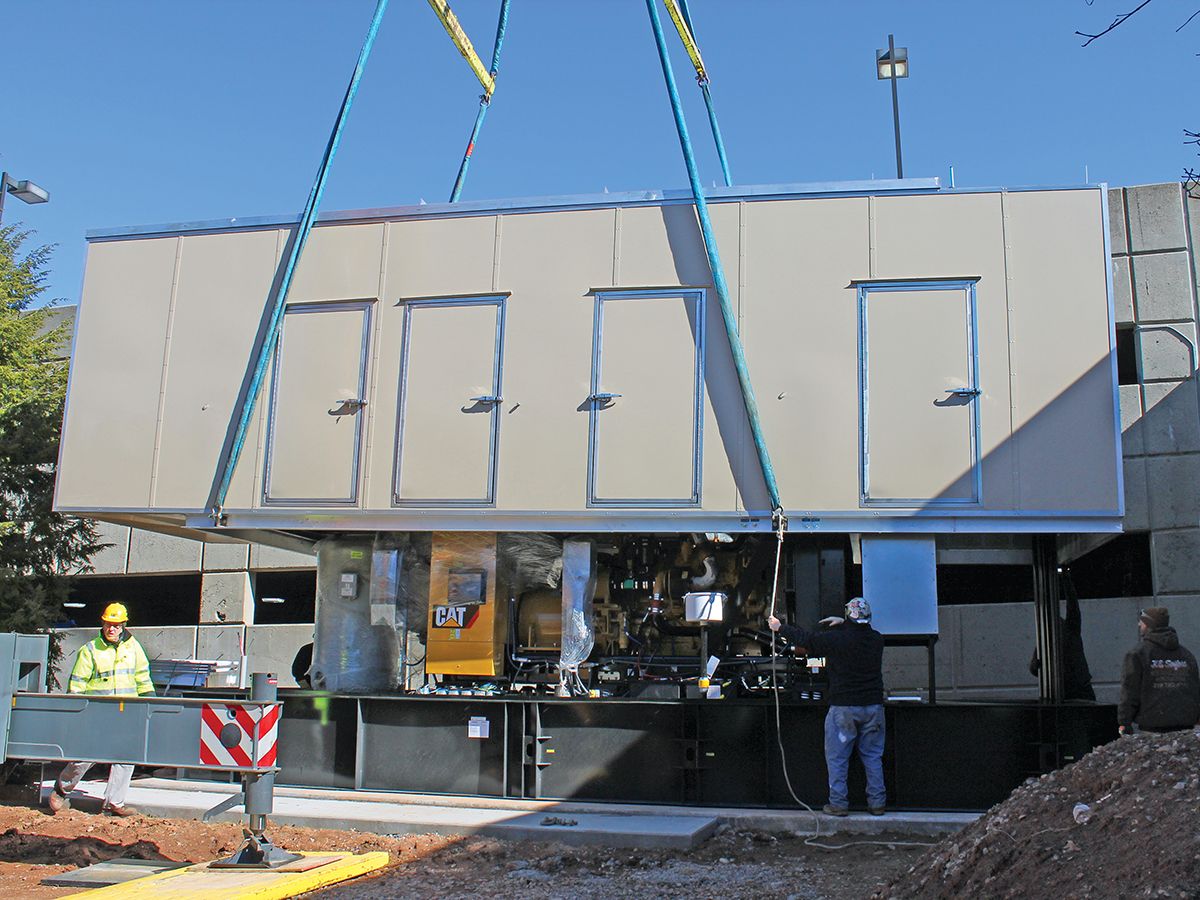To help mitigate noise from the generator set both inside city hall and in the nearby residential neighborhood, it was surrounded by a sound-attenuated enclosure built to exceed local noise ordinances.