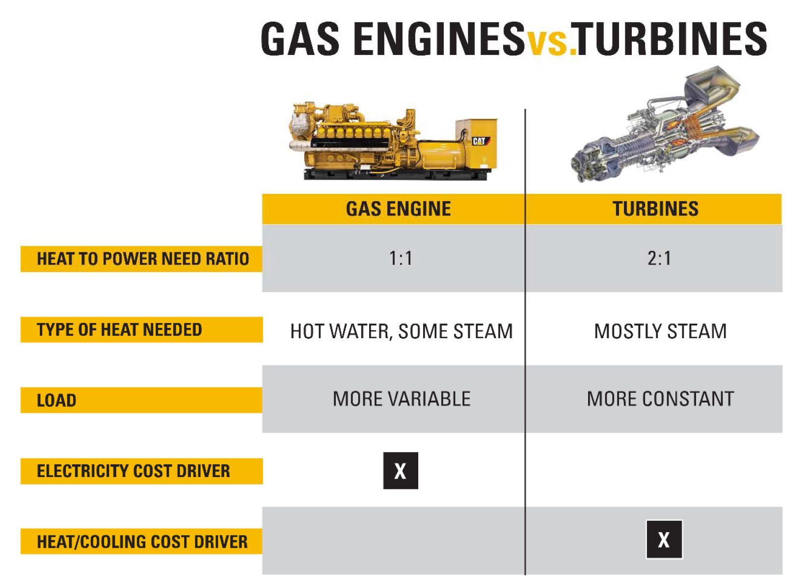 Neither technology is “better” than the other. Instead, each has attributes that make it the most suitable for specific conditions of fuel type and quality, electric and heat load profile, physical space, altitude, ambient conditions, and others. In fact, there are applications where reciprocating engines and turbines working in concert can provide the ideal levels of electrical reliability and efficiency, thermal output, load-following capability and, ultimately, return on investment.