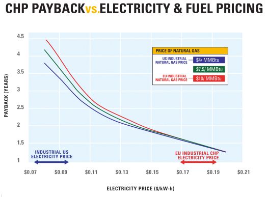 For example, at any give fuel price, payback time is similar at a gas price of $4/MMBtu (the prevailing industrial rate in the U.S.), $10/MMBtu (reference European subsidized price), or at points in between. However, payback time increases as electricity prices fall.