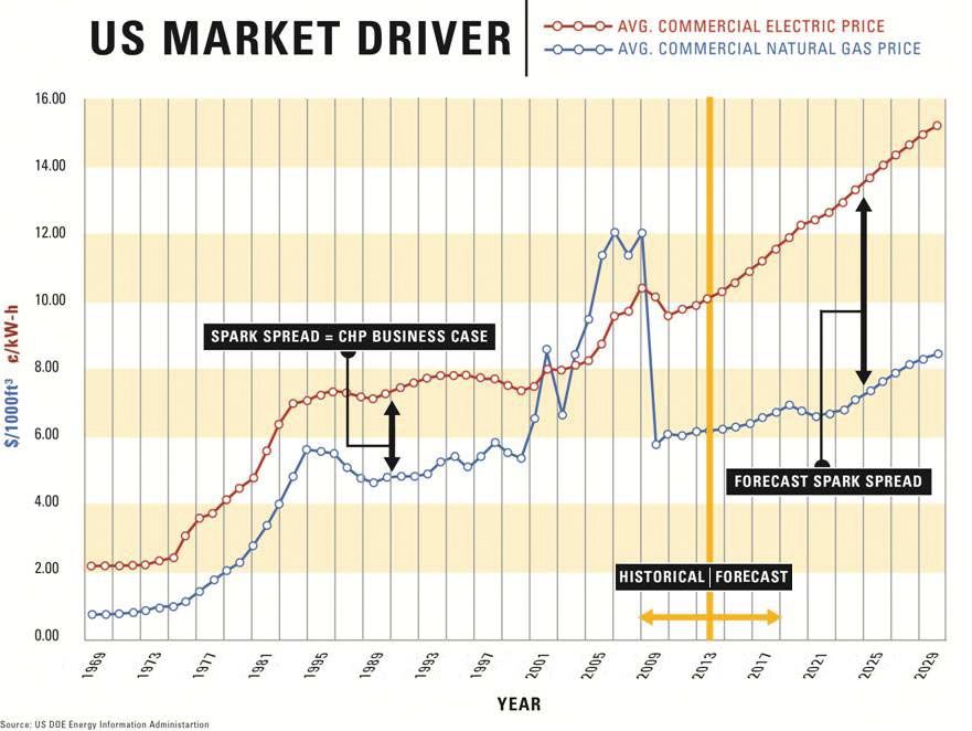 The market factors favoring gas-fueled cogeneration, aside from factors such as required power security, largely boil down to two words: Spark spread. Based on cost per equivalent unit of energy, commercial natural gas prices in North America are significantly lower than electricity prices, and projections show the gap increasing for the next two decades. See Figure 1.1