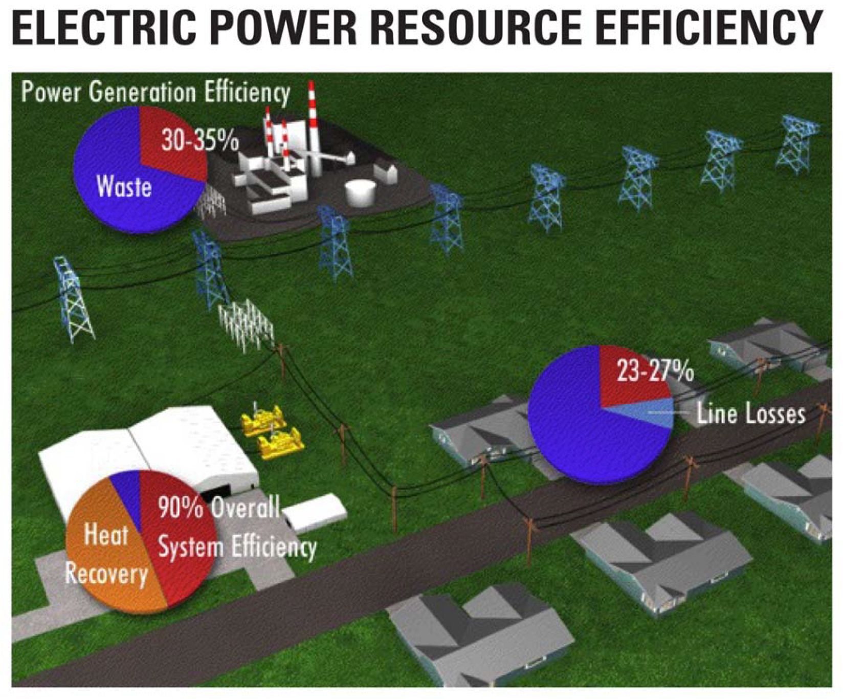 As distributed power resources, engines and turbines are inherently more efficient than large, centralized power plants. For example, a coal-fired utility power plant is typically 30 to 35 percent efficient, and line losses in long-distance transmission and distribution mean net efficiency at the point of use may be as low as 23 to 27 percent. By comparison, a gas engine or turbine installation will deliver 35 to 45 percent electrical efficiency (based on fuel low heating value), and line losses are minimal if the power is used nearby. The addition of heat recovery can boost total resource efficiency to 90 percent, or even higher. See Figure 2.
