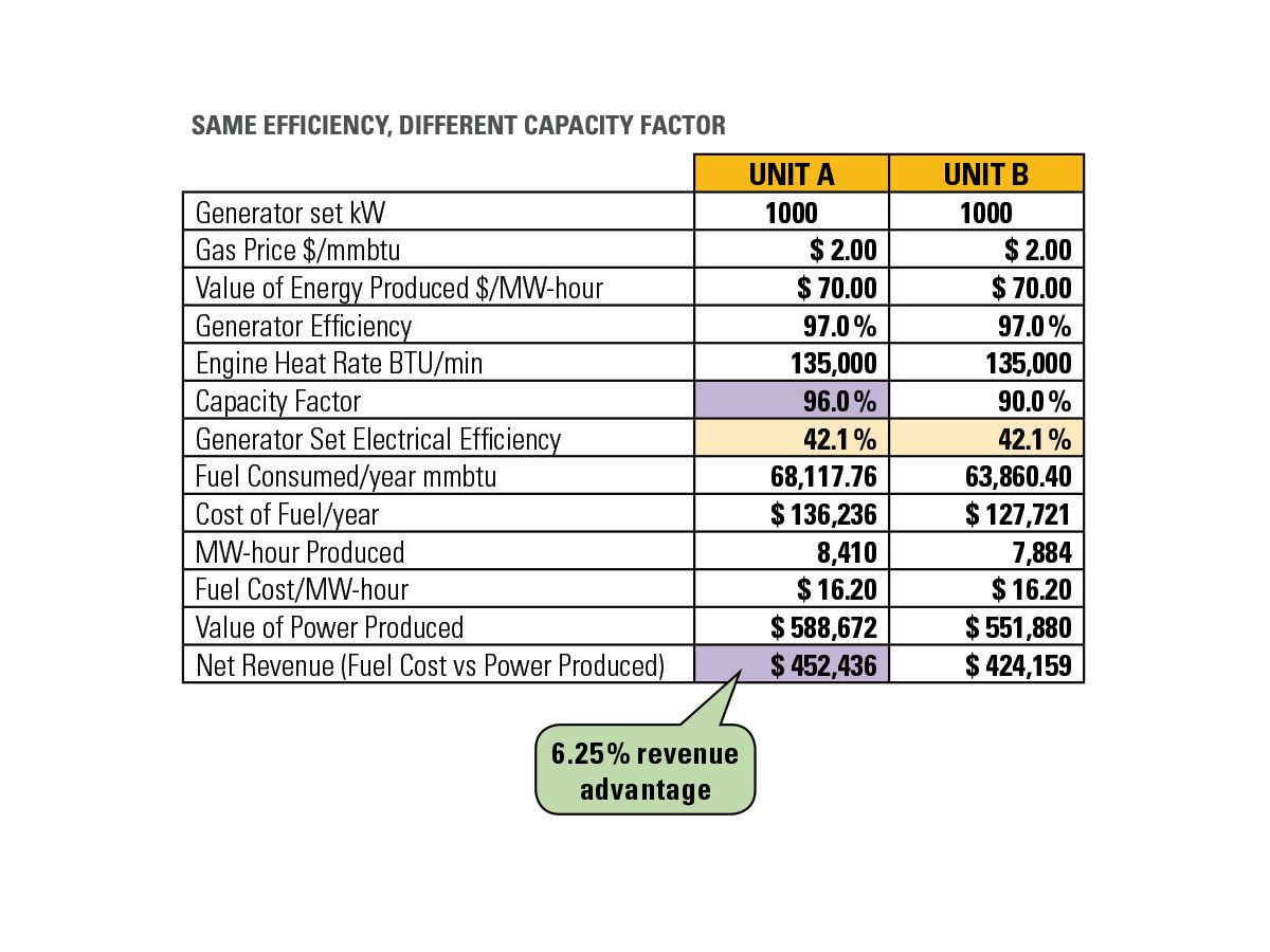 A simple scenario illustrates the tradeoff between generator set electrical efficiency and availability, as they affect revenue. Assume two 1 MW units, an electricity sale price of $70 per MWh, and a fuel production cost of US$1.90 / GJ (US$2 /MM Btu).