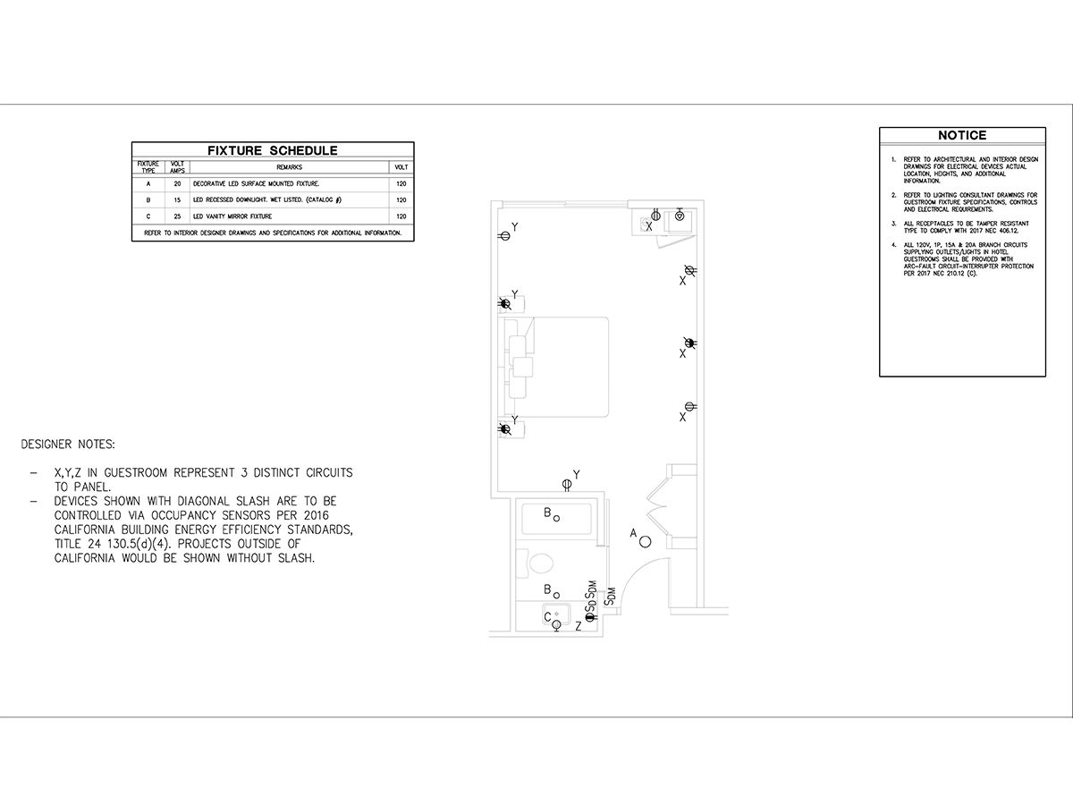 Enlarged guest room unit plans—Develop the design for the typical enlarged (typically 0.25- to 1-in.-scale) guest room units based on information provided by the architect/interior designer. Receptacle layouts shall comply with NEC 210.8(A), 210.12(C), and 210.60 requirements.