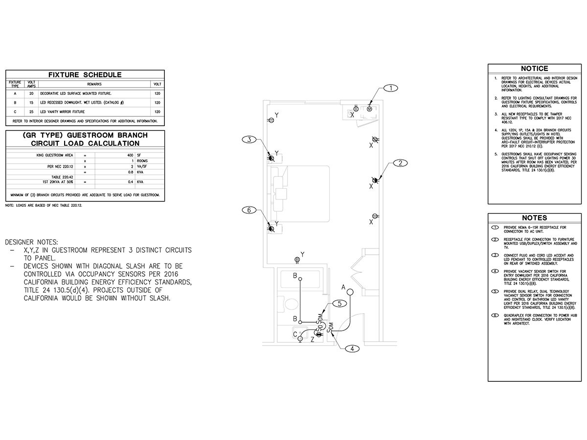 Enlarged guest room unit plans—Finalize the circuiting and lighting/controls design for the typical enlarged guest room units based on information provided by architect/interior designer and other consultants. Consider the demands allowed by NEC Table 220.