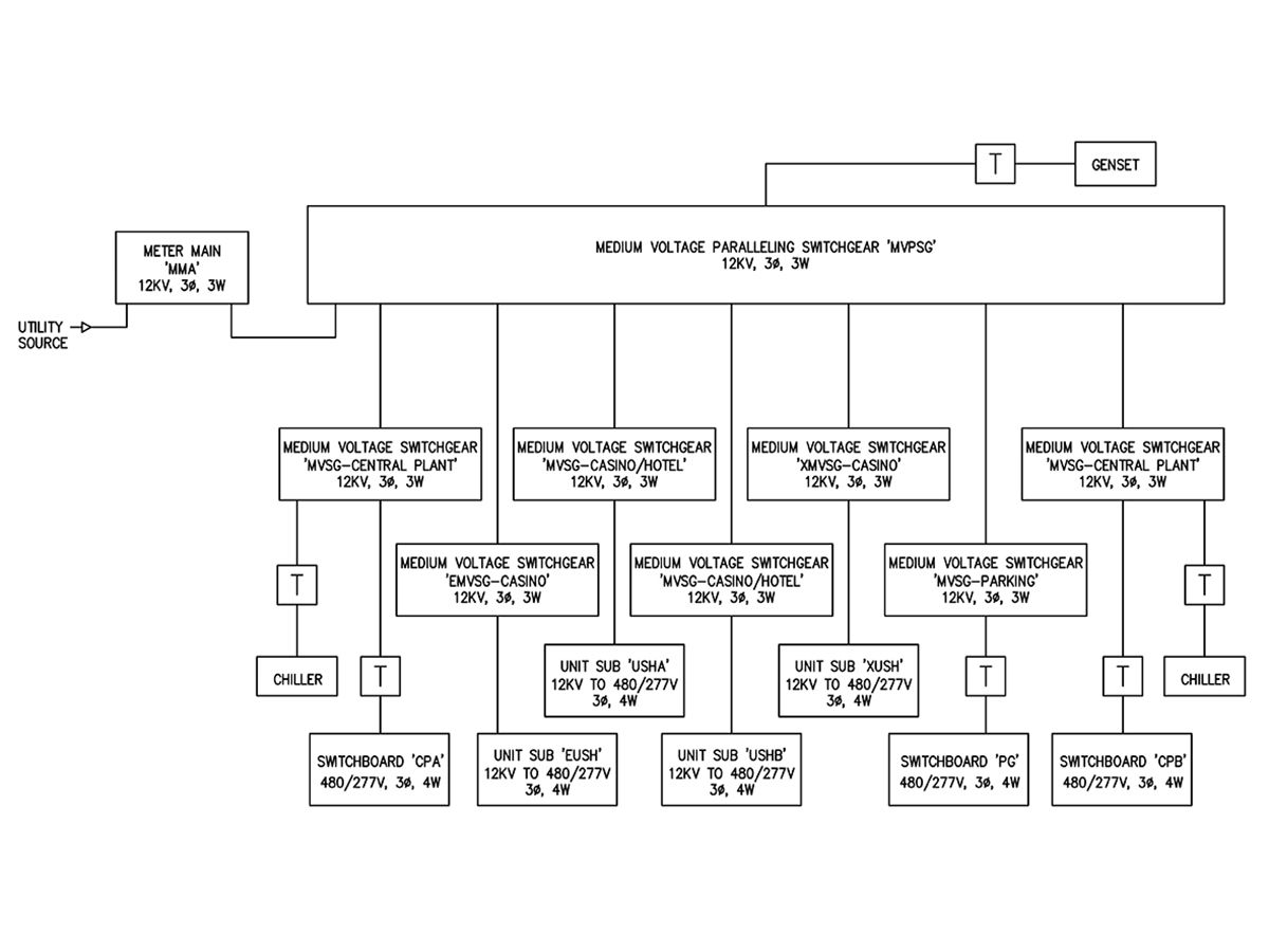 Once preliminary loads have been completed and utility service and switchgear ampacities have been estimated, a preliminary electrical distribution system should be developed. The single-line diagram should include the main switchgear, step-down transformers from medium-voltage system to 480/277 V distribution, generators, automatic transfer switches (ATS), uninterruptable power supply (UPS), optional standby systems, 480V/277 V distribution boards, 480/277 V to 208/120 V transformers, panelboards, feeders, preliminary connections to chillers, air handling units, fire pumps, hydronic heat pumps, cooling towers, elevators, etc.